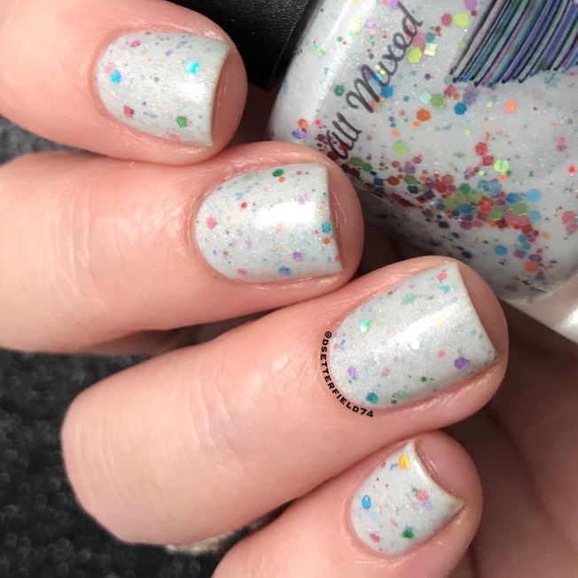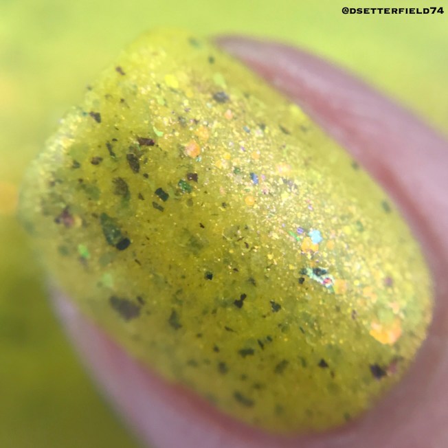 The glitters here did settle pretty well in the bottom of the bottle, but they floated right back up with a vigorous shake. I love how you get a gentle dose of them on the nail. It’s not GLITTER! with jazz hands, but more just glitter with like, some sweatpants on. Nice and easy is what I’m saying.