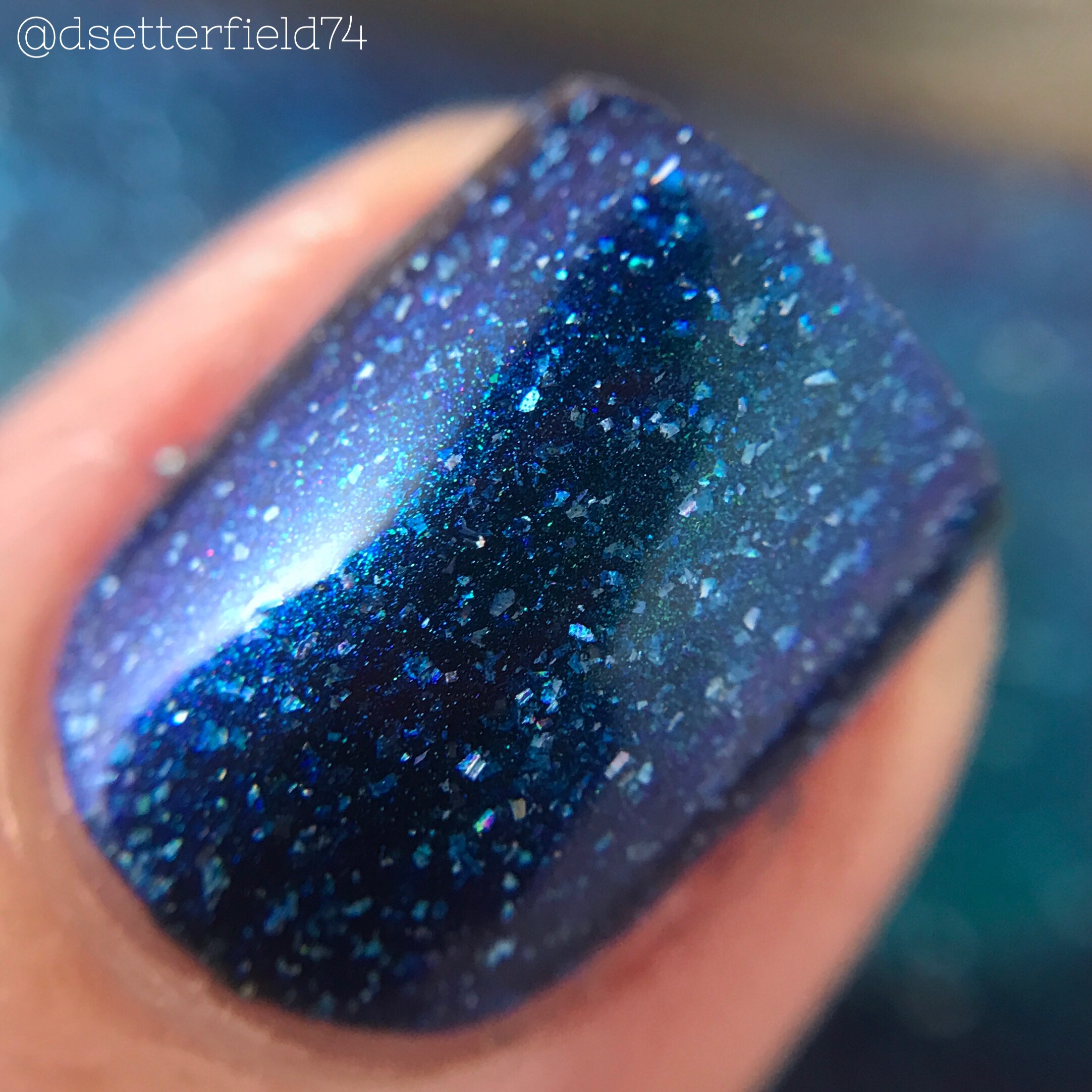 Look at this beauty! I am so drawn to this cheerful blue shade; it makes me so happy just to look at it. Then Leah Ann goes and throws some shimmer in it, and OMG, it’s noodle legs to like the trillionth degree. And look at those little flakies peeking through .. gah! We lub it lots, oh yes we do.