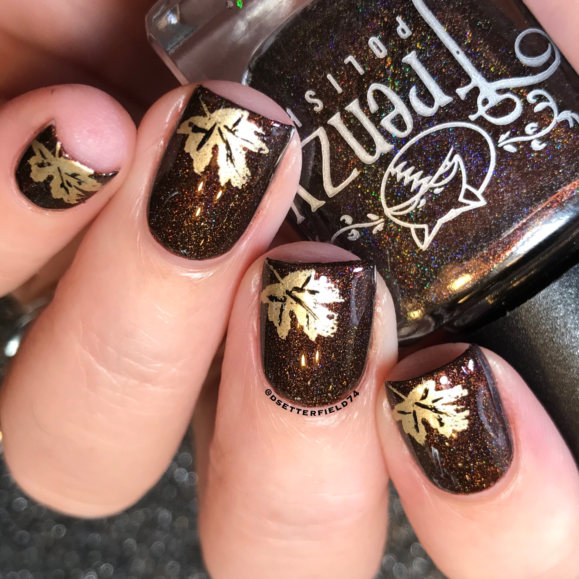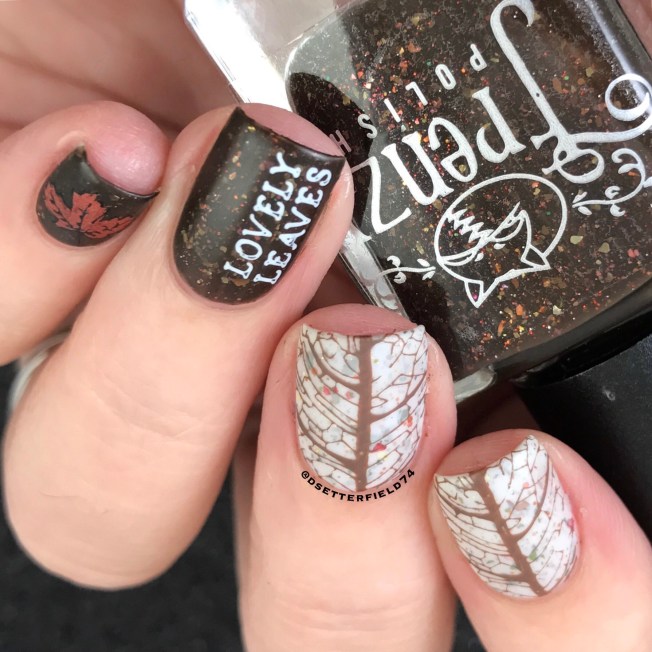 I used both Fireside Therapy II and Falling Leaves II plus some stamping using the Uber Chic Beauty Lovely Leaves plate and B. Loves Plates Leaves of Happiness. I went all out on this one, and luckily it didn’t turn into a scary hot mess. Every once in a while, things work out. The Fall Gods are watching.