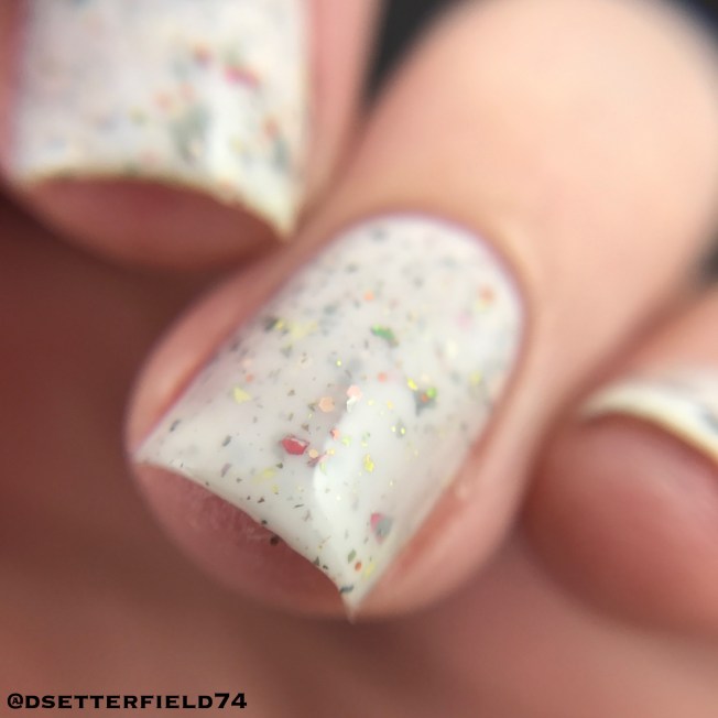 I get it; white crellies can be scary. A lot of times they are too milky, uneven, streaky and dumb. However, give this one a try. It is flawless. Three thin coats here, and effortless. And those autumn colored flakes and glitters: divine.