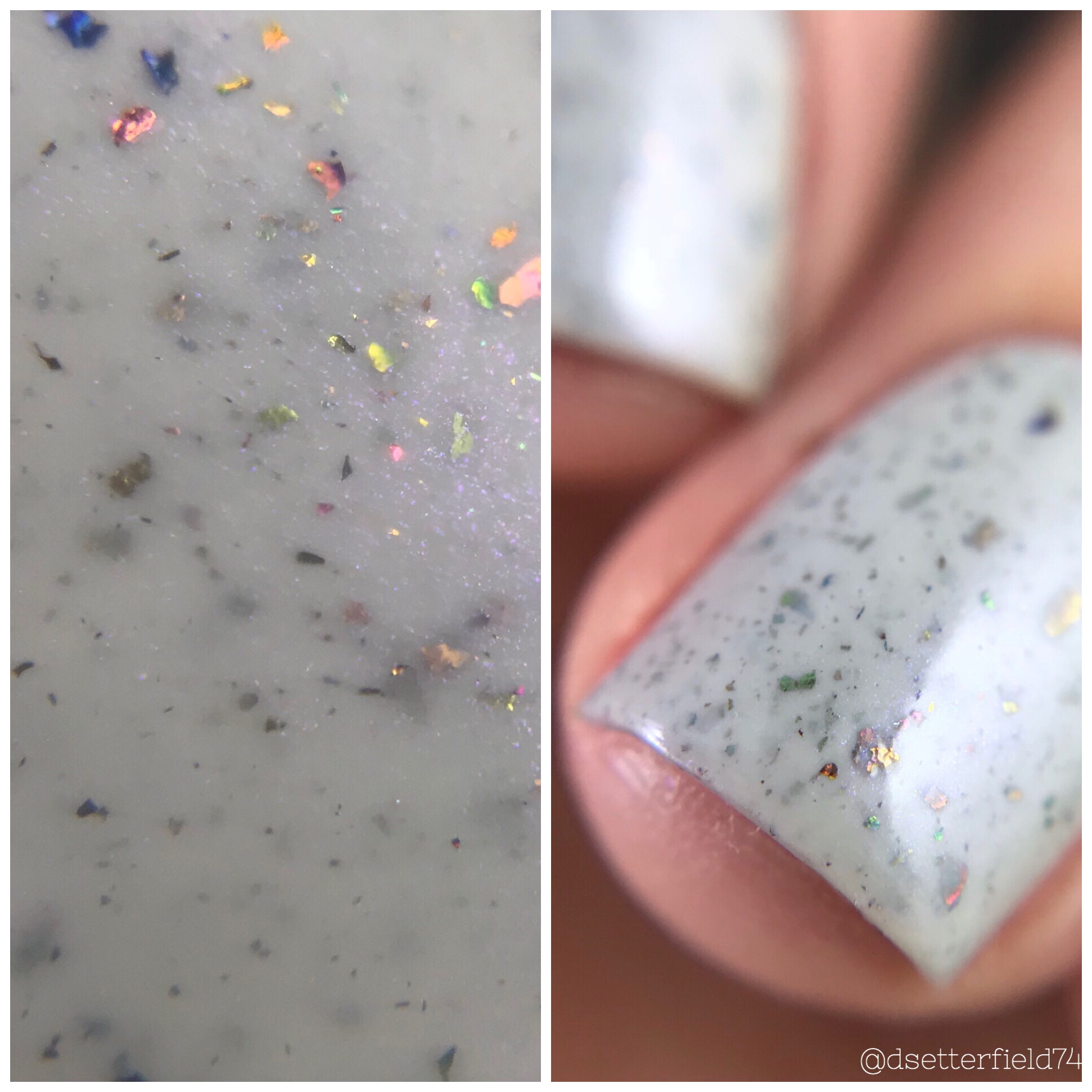 DESCRIPTION: A light grey with violet shimmer and rainbow metallic flakies
