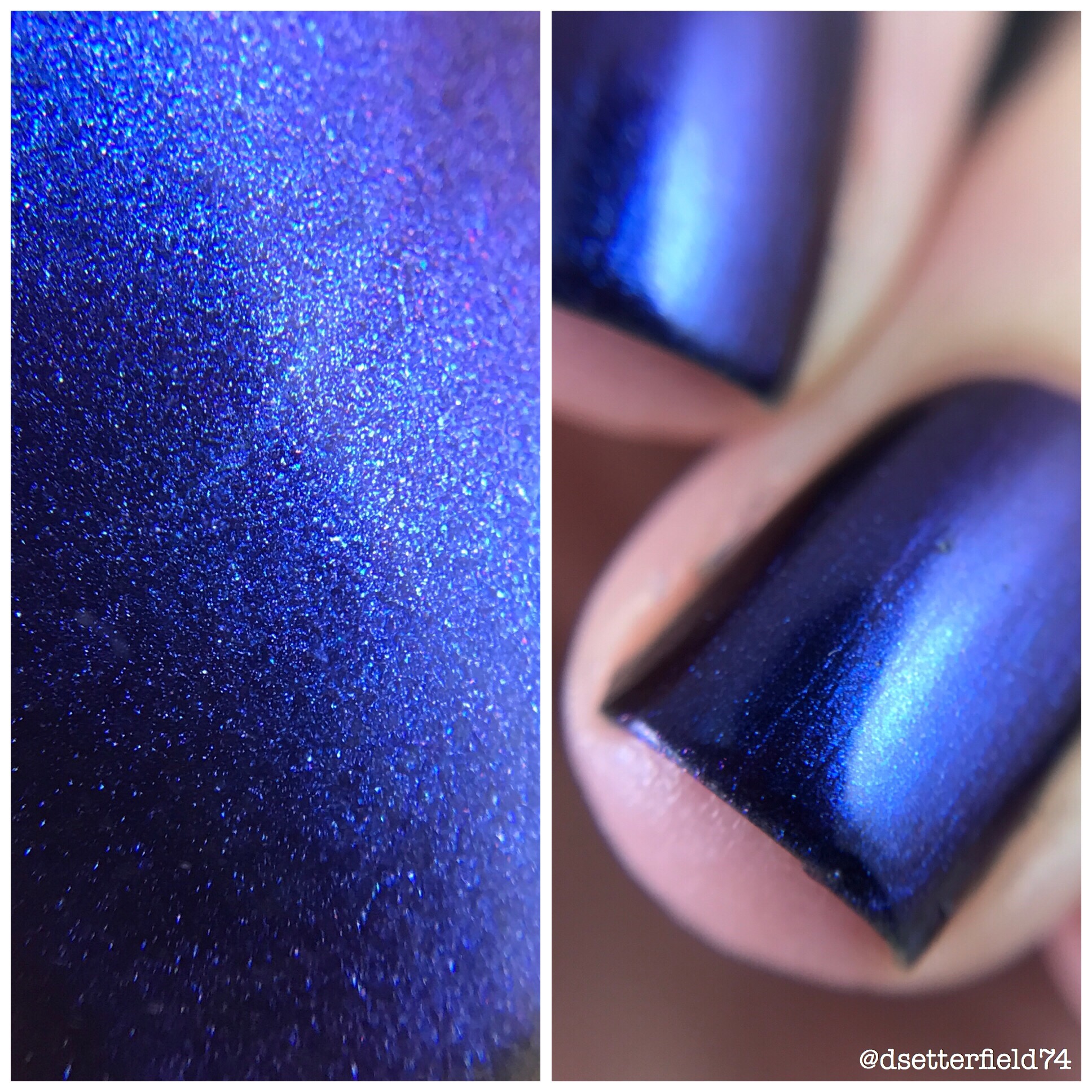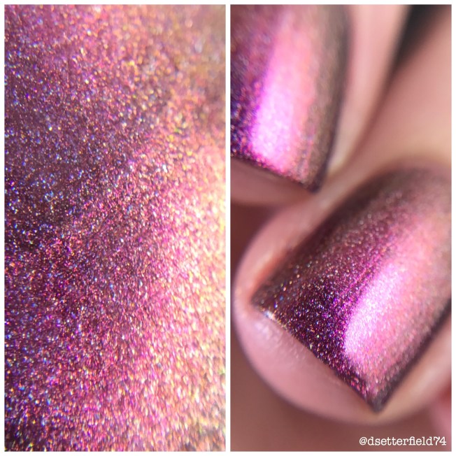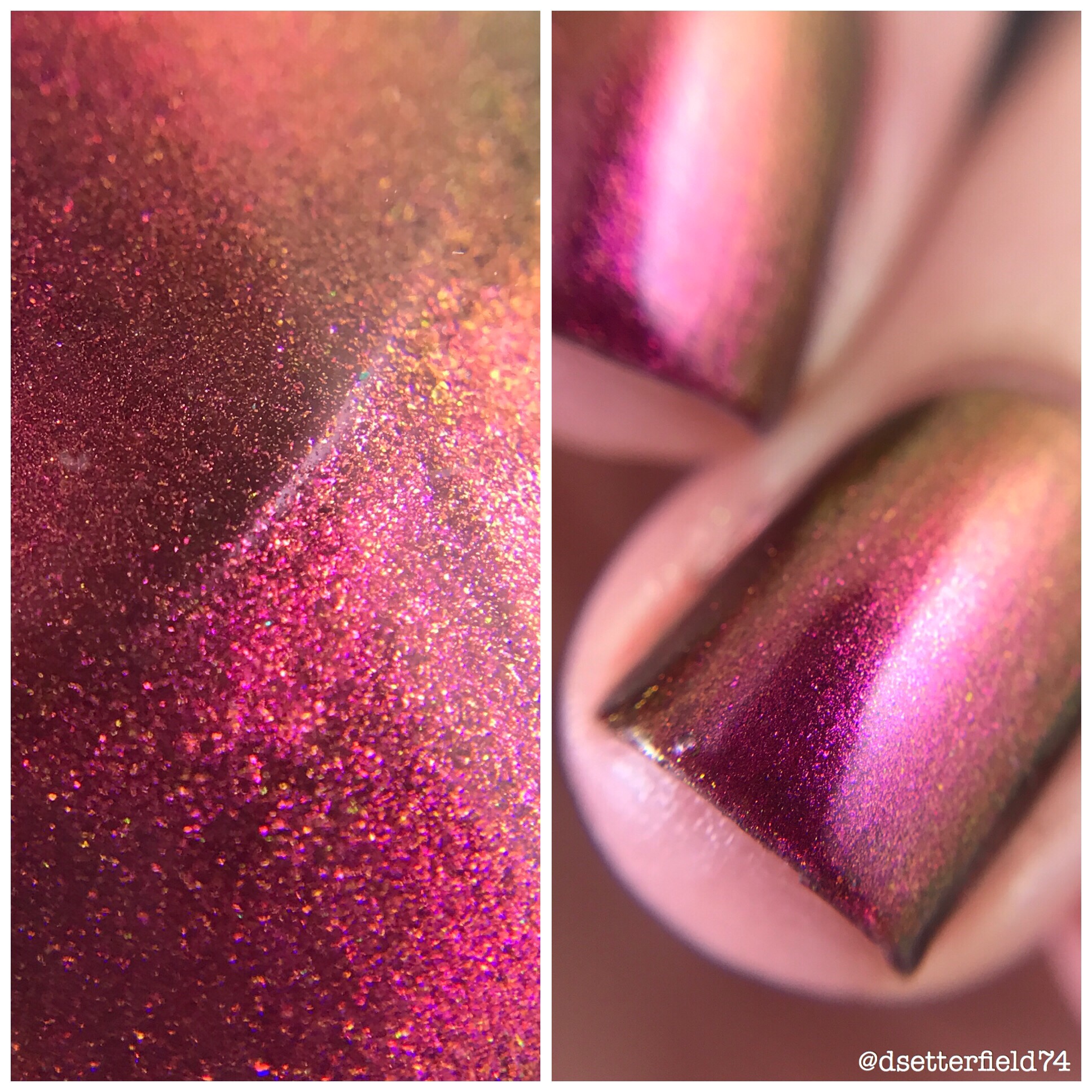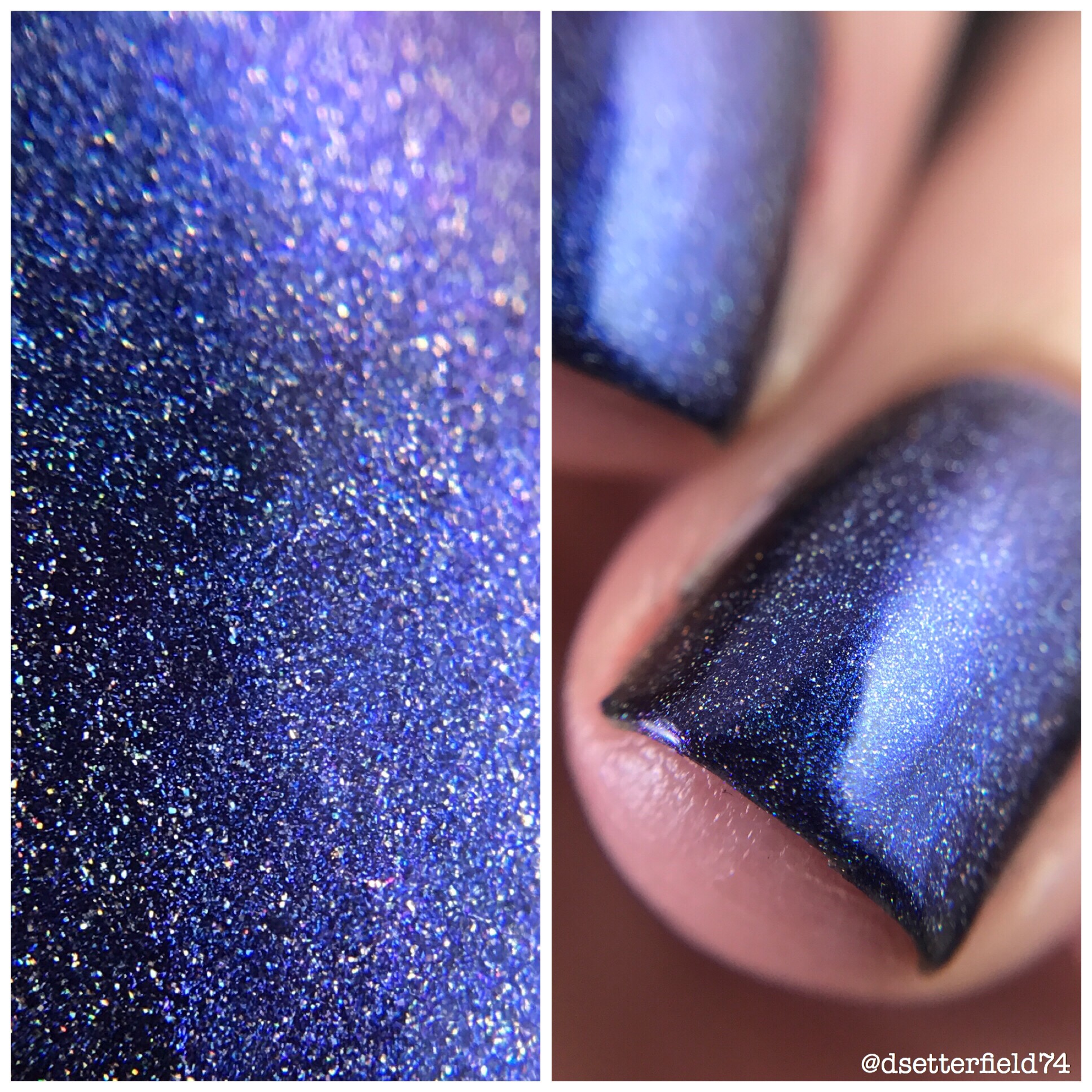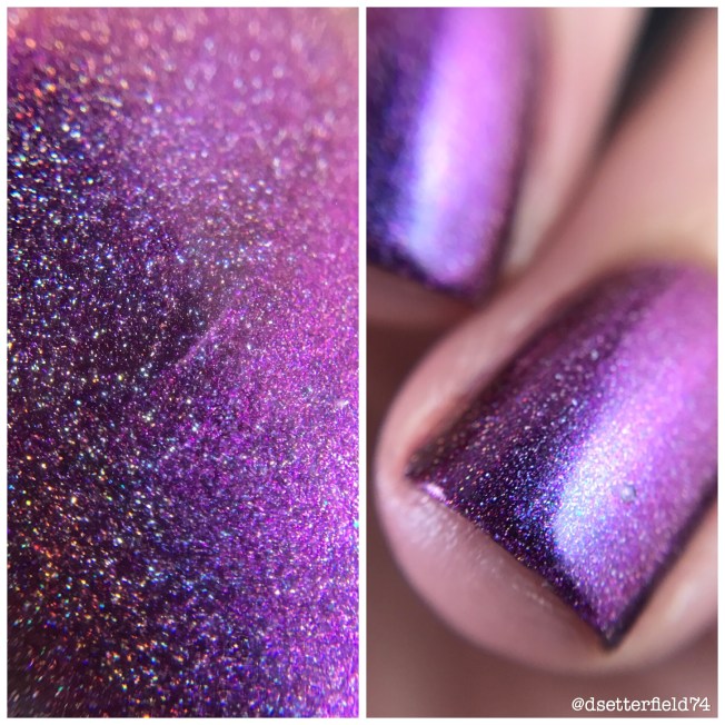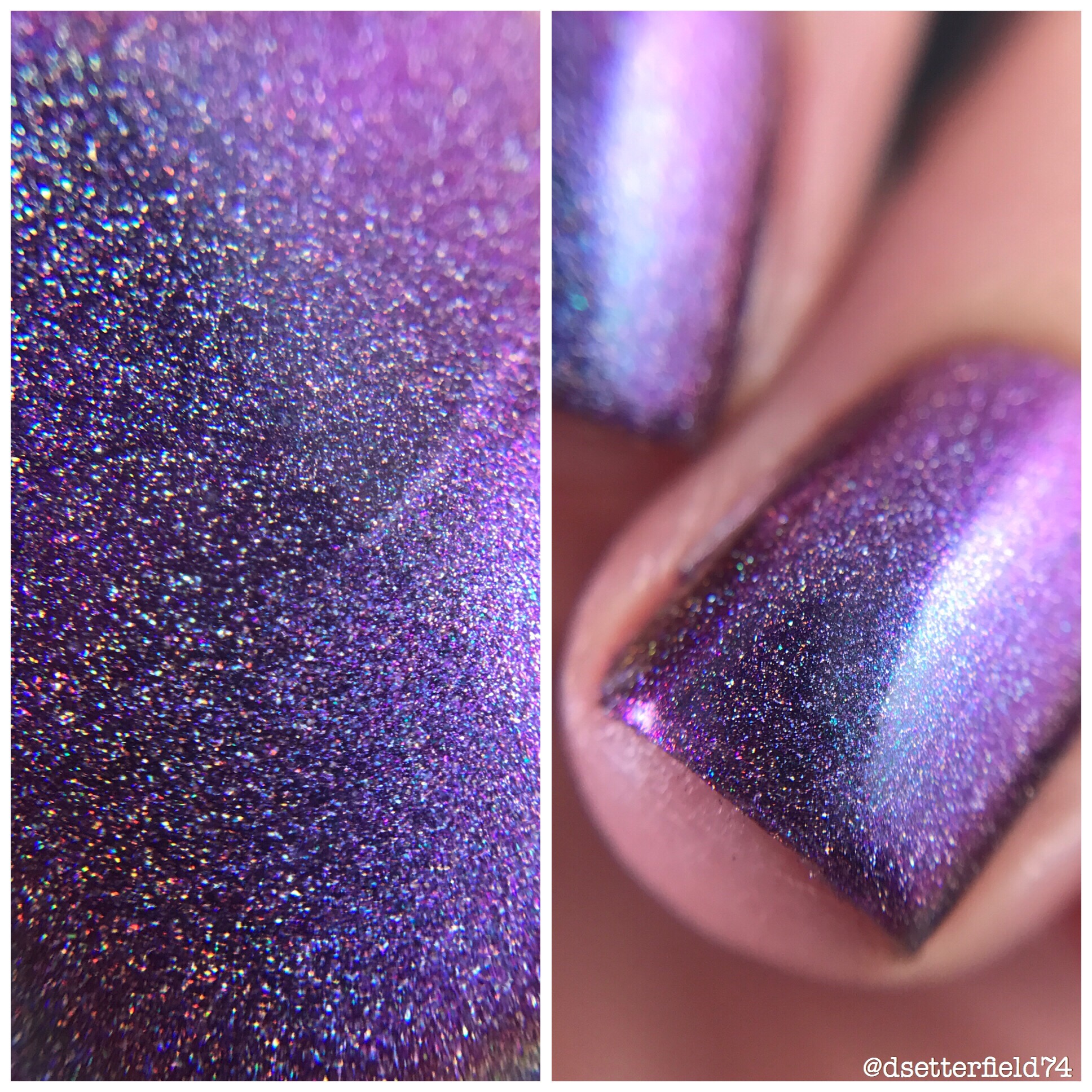 This beauty shifts from blue to purple to reddish in a tinted jelly base with a linear holographic finish. For me, the holo hid the shift a little bit so I think I prefer the straight multichrome version of this one. HOWEVER, I continue eating whole bags of Funyuns (in a room by myself), so my opinion might be moot. You decide for yourself, lovies. I’m just gonna go sit back down now.