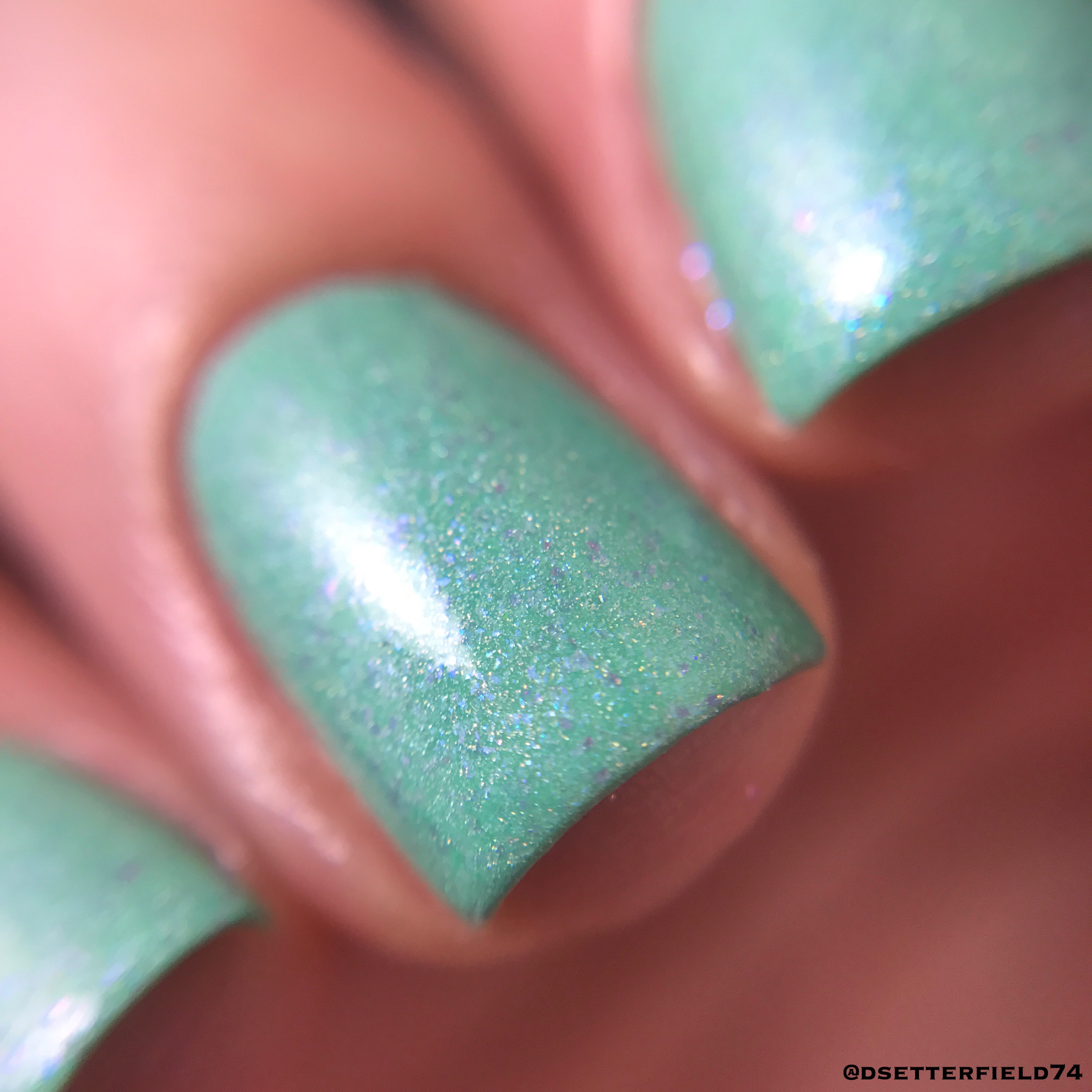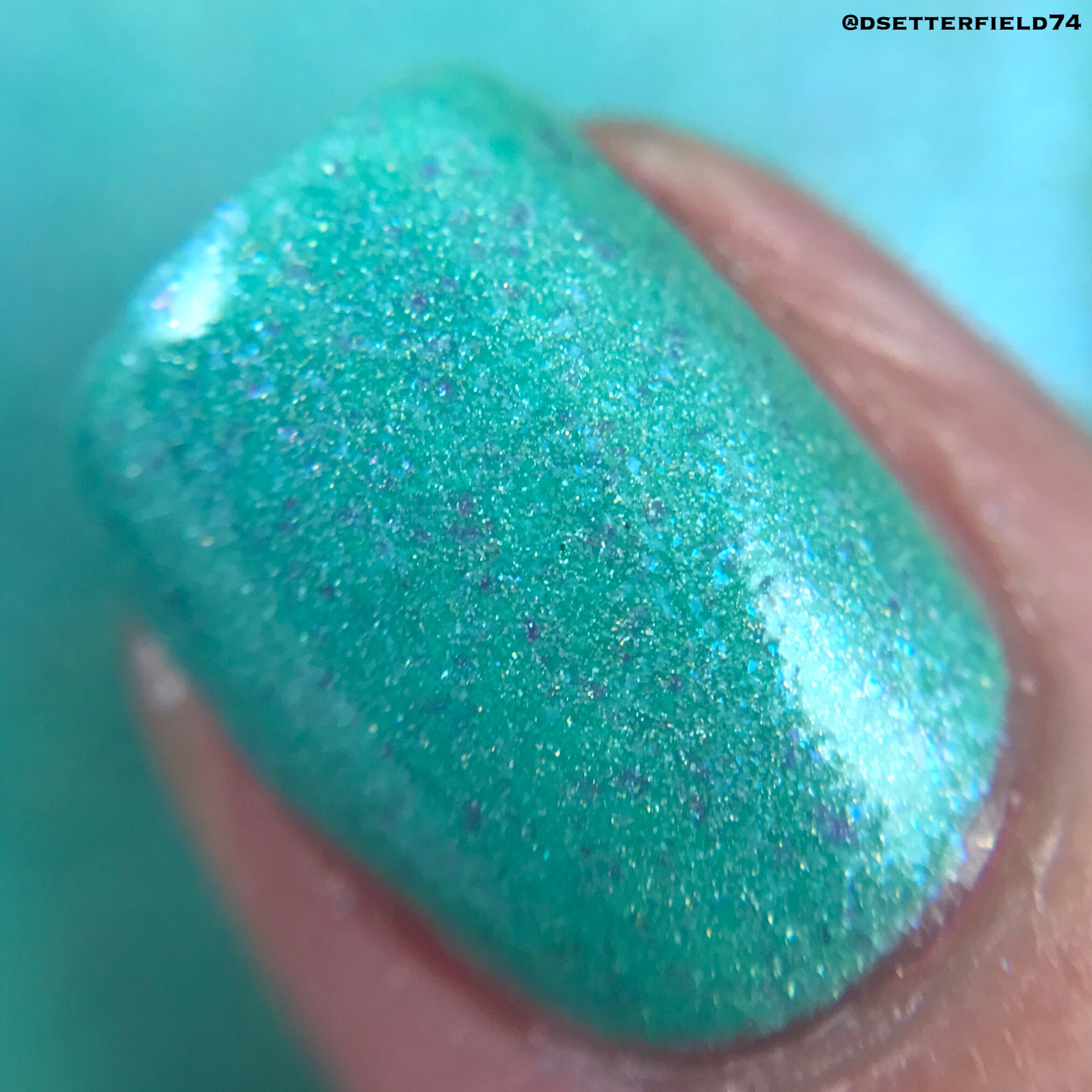 So this one has an aqua-green base with a golden shimmer, gold-bronze flakies and some linear holo for extra tongue lolling. My swatch only required two coats to opacity, and the new brush (again) made quick work of it. The color is so comfy cozy, and GREEEEEEN, which means I lub it lots. It’s a dire case of noodle legs, and the Ugly Ecstasy Face is in full effect. I’m a walking pile of sex, as you might imagine.