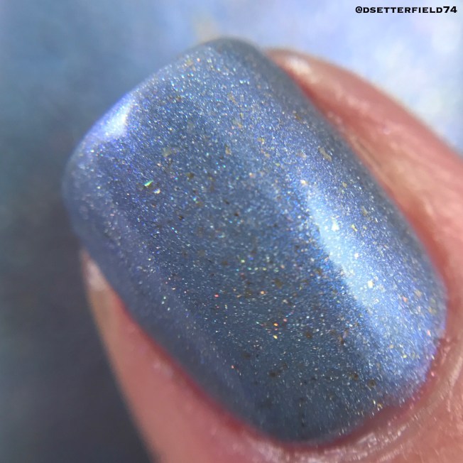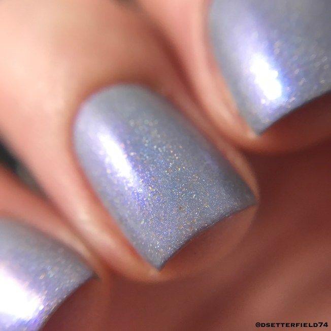 So this one is a dusty yellow base that slightly leans green with a red-purple shimmer, blue-green flakies and holo flakies. It has a bit of a sheer finish and my swatches are two coats, although adding a third gets it pretty opaque. I didn’t prefer the third coat though; the yellow looked so elegant with a tiny bit of nail line peeking through.