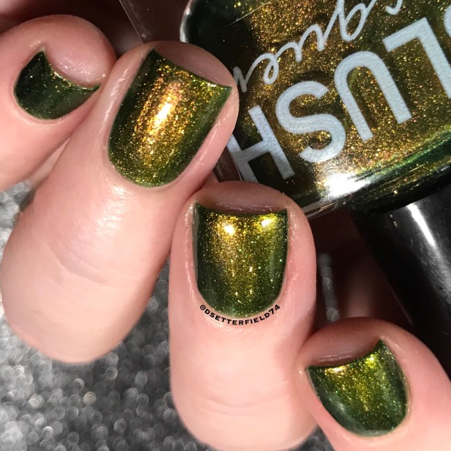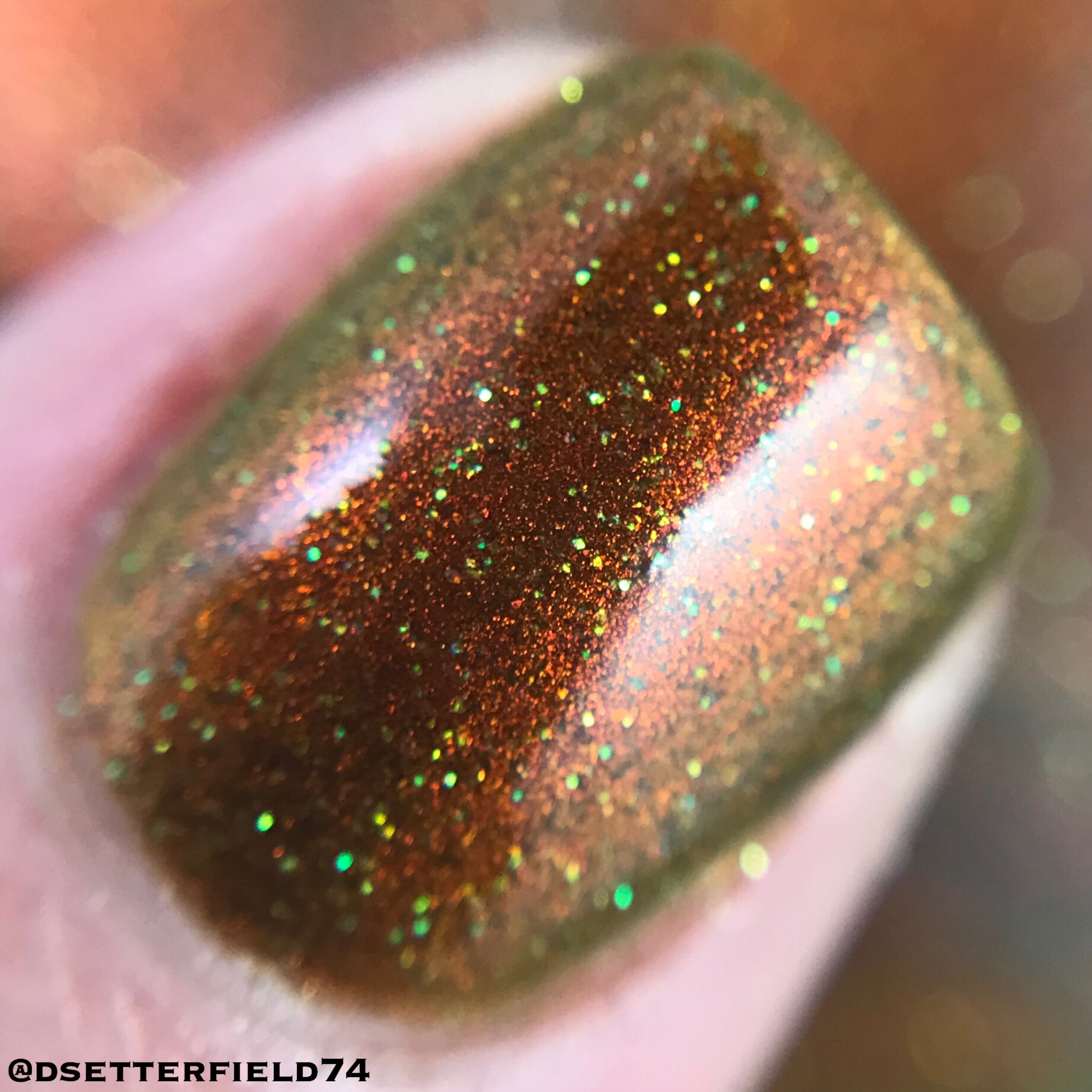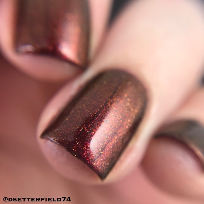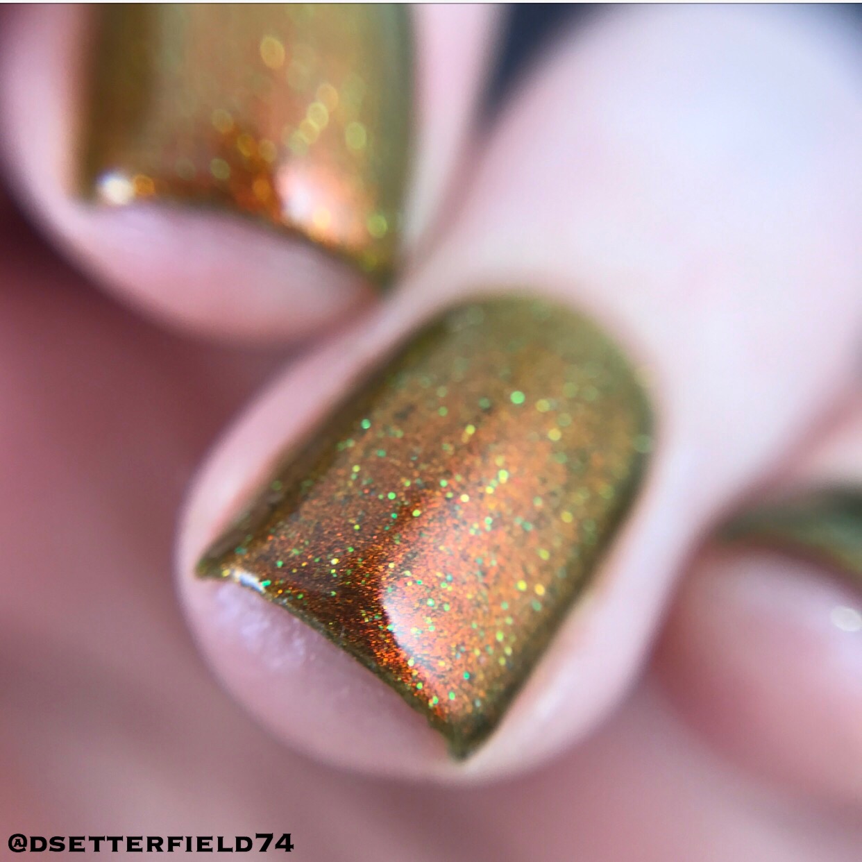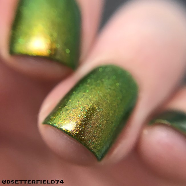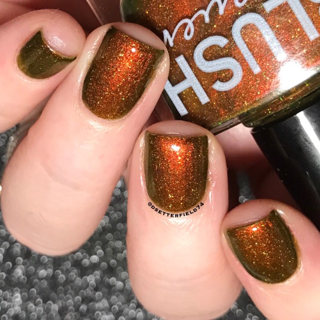 I stinkin love this gold. It’s a brilliant shade full of coppery orange glitters and bits that give me some serious feels. Right after green, orange is next, so for that fact alone, I want this polish on all my surfaces. It’s bright, blingy, flashy and fabulous! Like me.