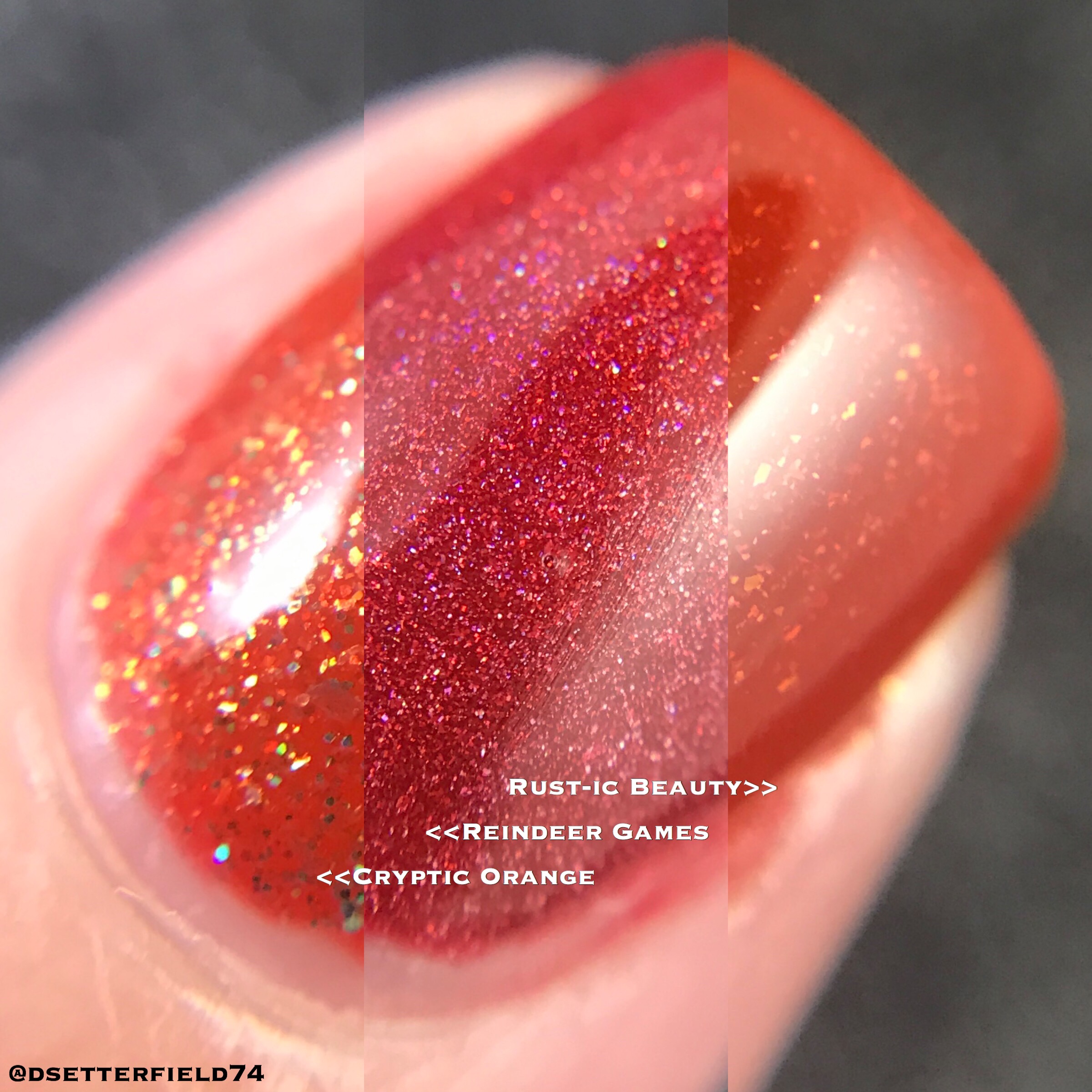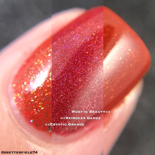I did a split macro to show you the differences in Reindeer Games and two other colors you may have in your collection. This was hard work getting the images to line up (or not line up), sooooooo …