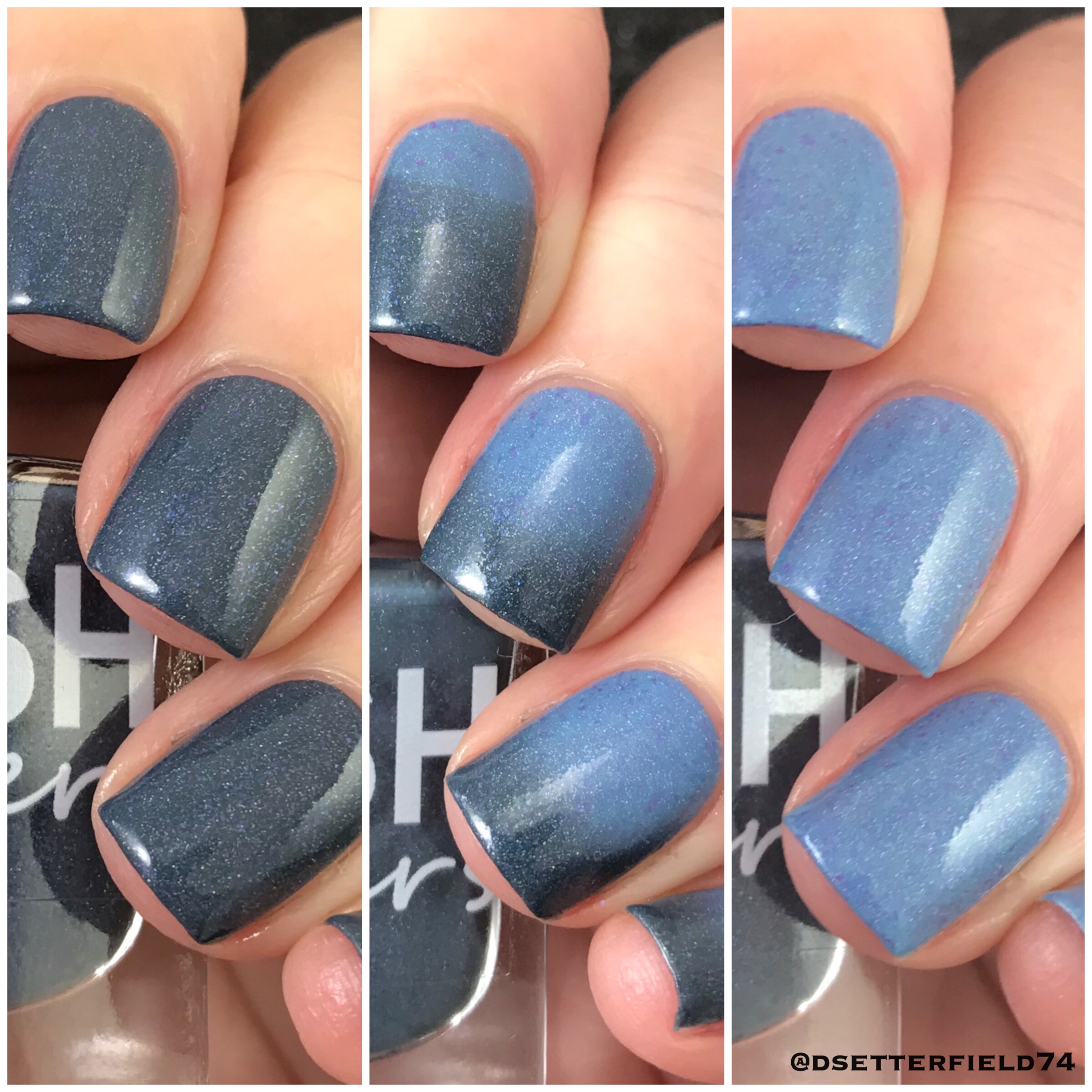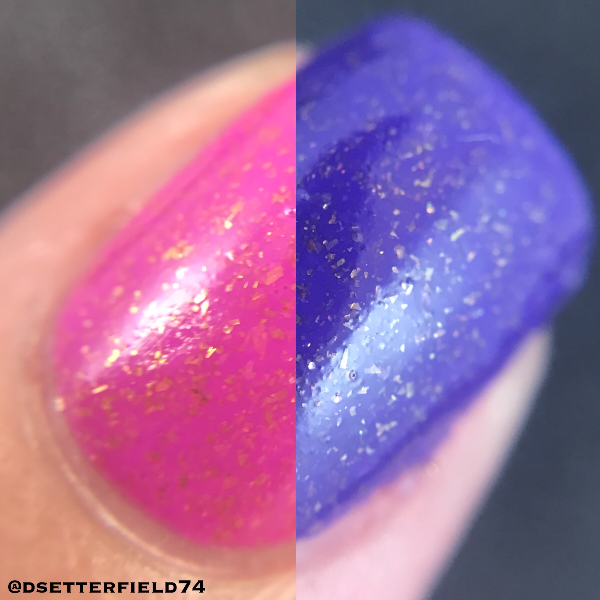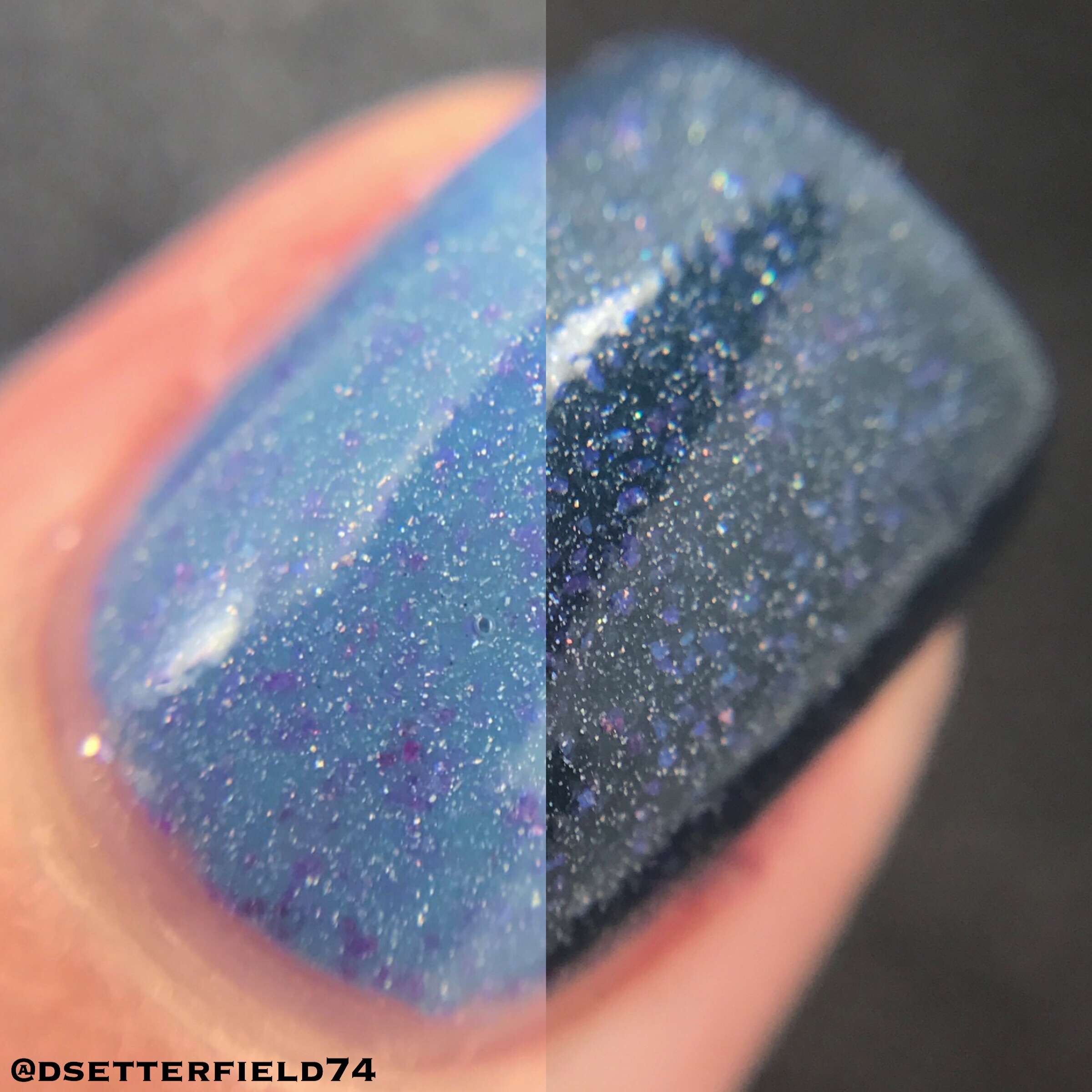 Base on this one is like a faded denim blue when warm then dark blue-grey when cooled with added holo and magenta to blue shifting flakies. I love how these two shades blend together. A perfect combo. If it was any more perfect, it might as well be a couch and pajamas, cuz I can’t think of anything else more fabulous than that.