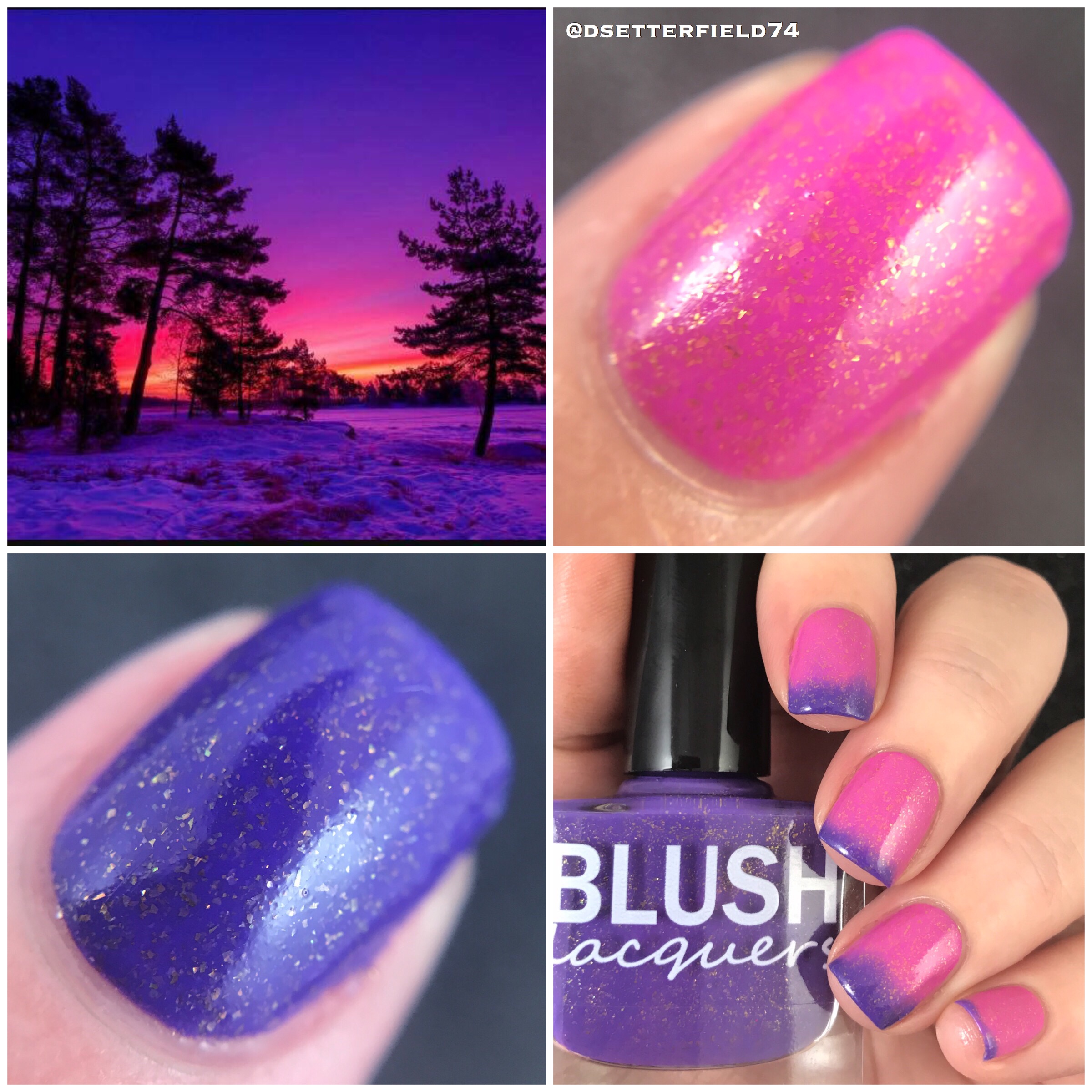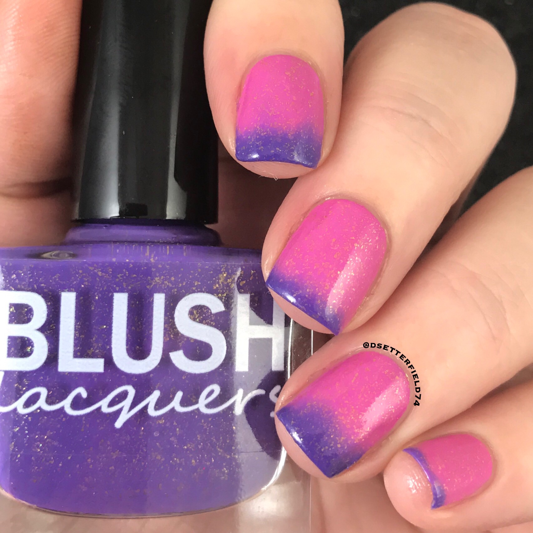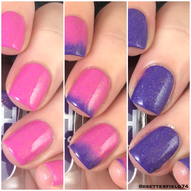 On this one, we have a pink base in its warm state which turns to purple once cool and loaded with gold flakies. It was hard to capture a really sweet blending shot since the pink and purple were such opposites, but it was either these photos or I’d still be standing in my kitchen with my hand in the freezer. Swatching can be hard sometimes.