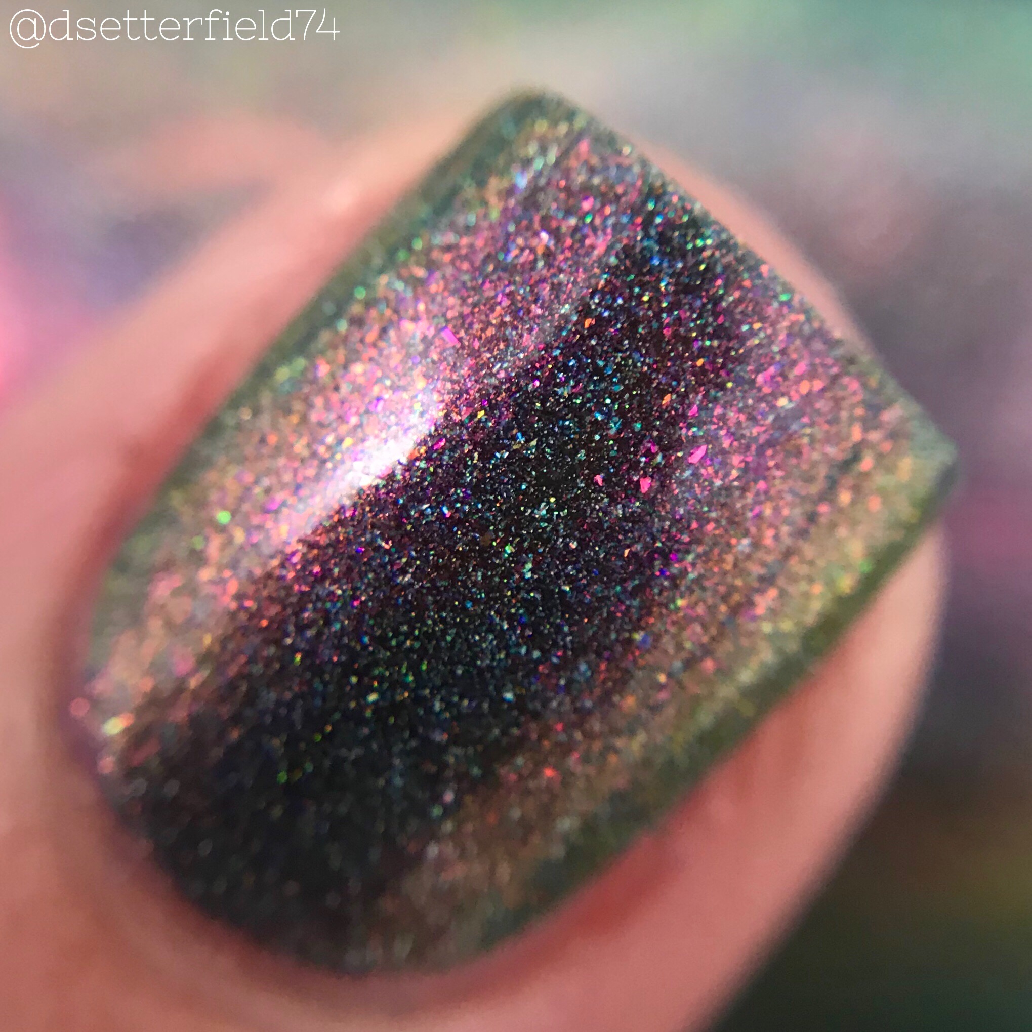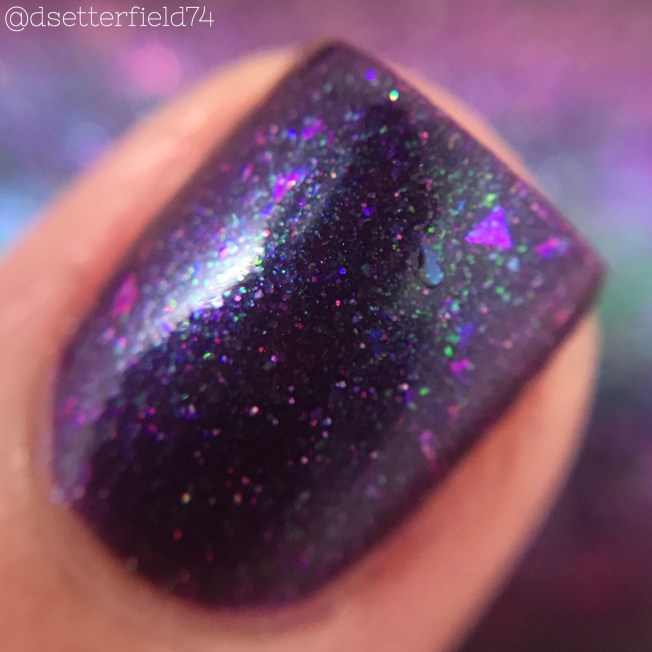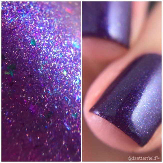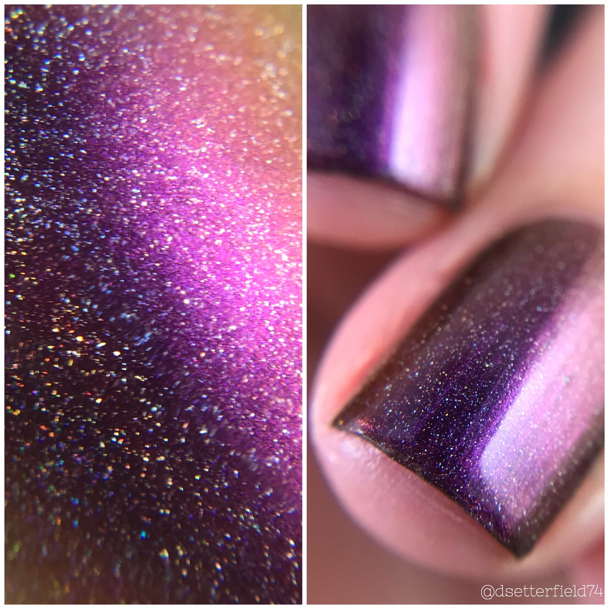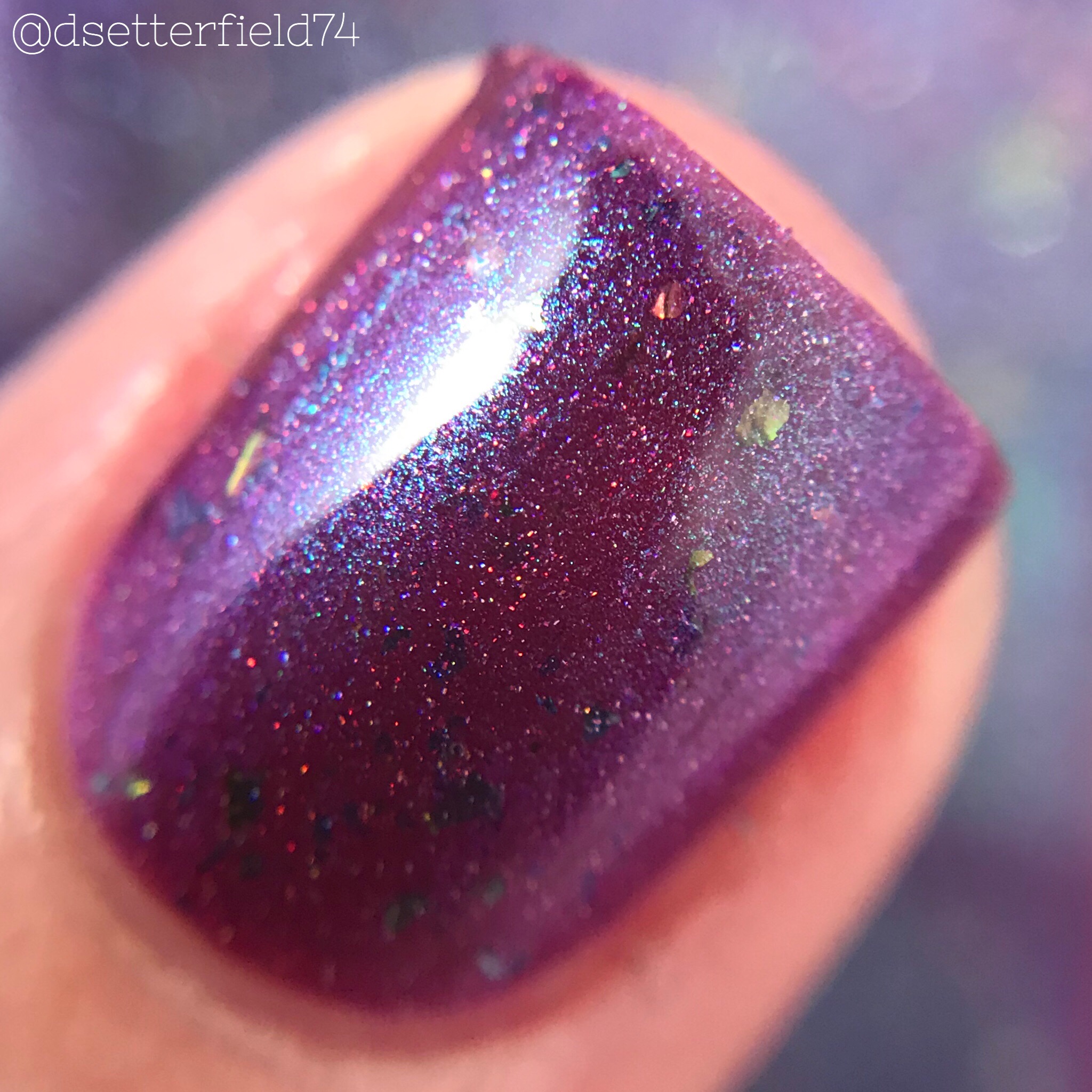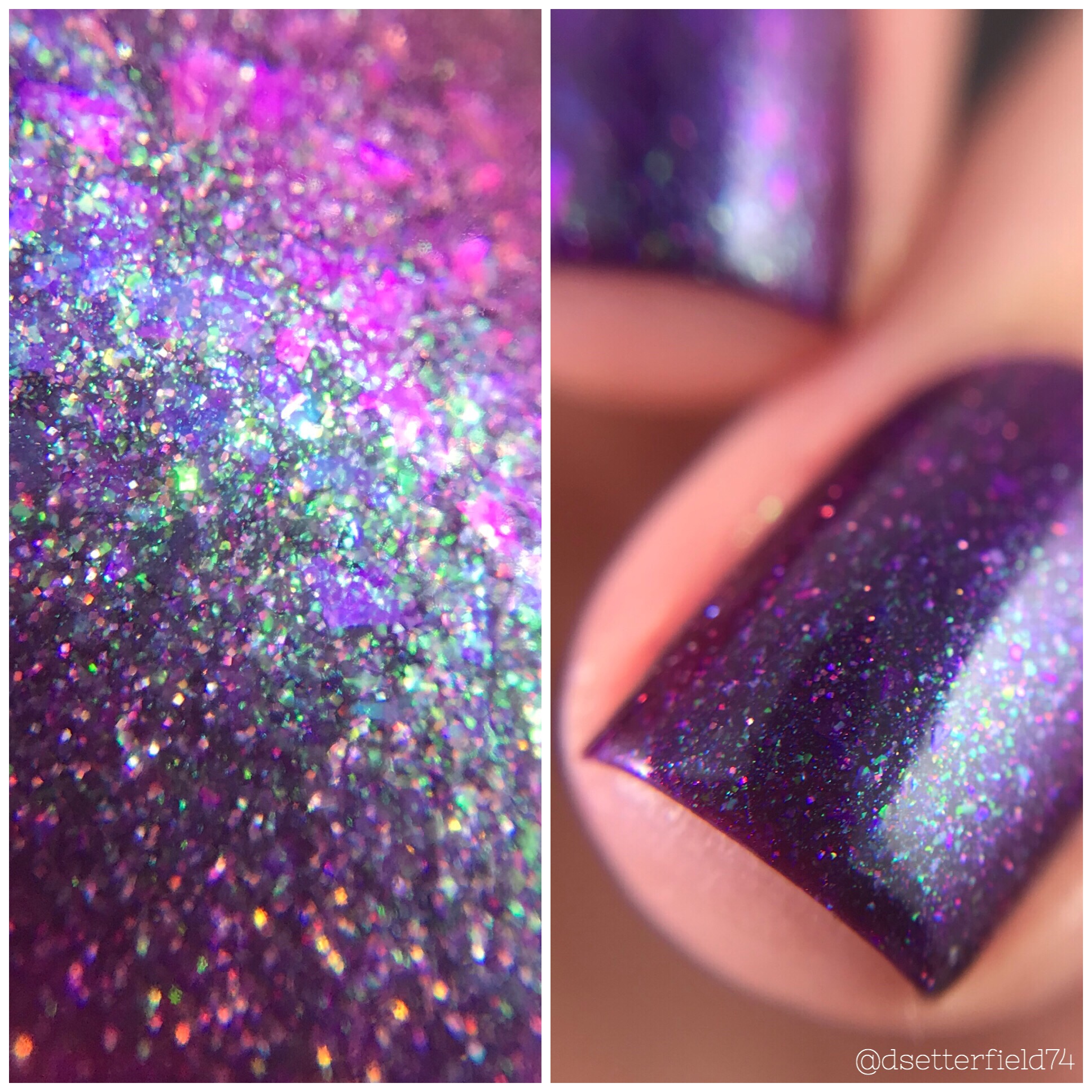 DESCRIPTION:  A deep grape purple with green/fuchsia/purple large particle multichrome shimmers, a hint of green//fuchsia/purple multichrome shimmer, iridescent flakies and tiny silver holographic microglitters