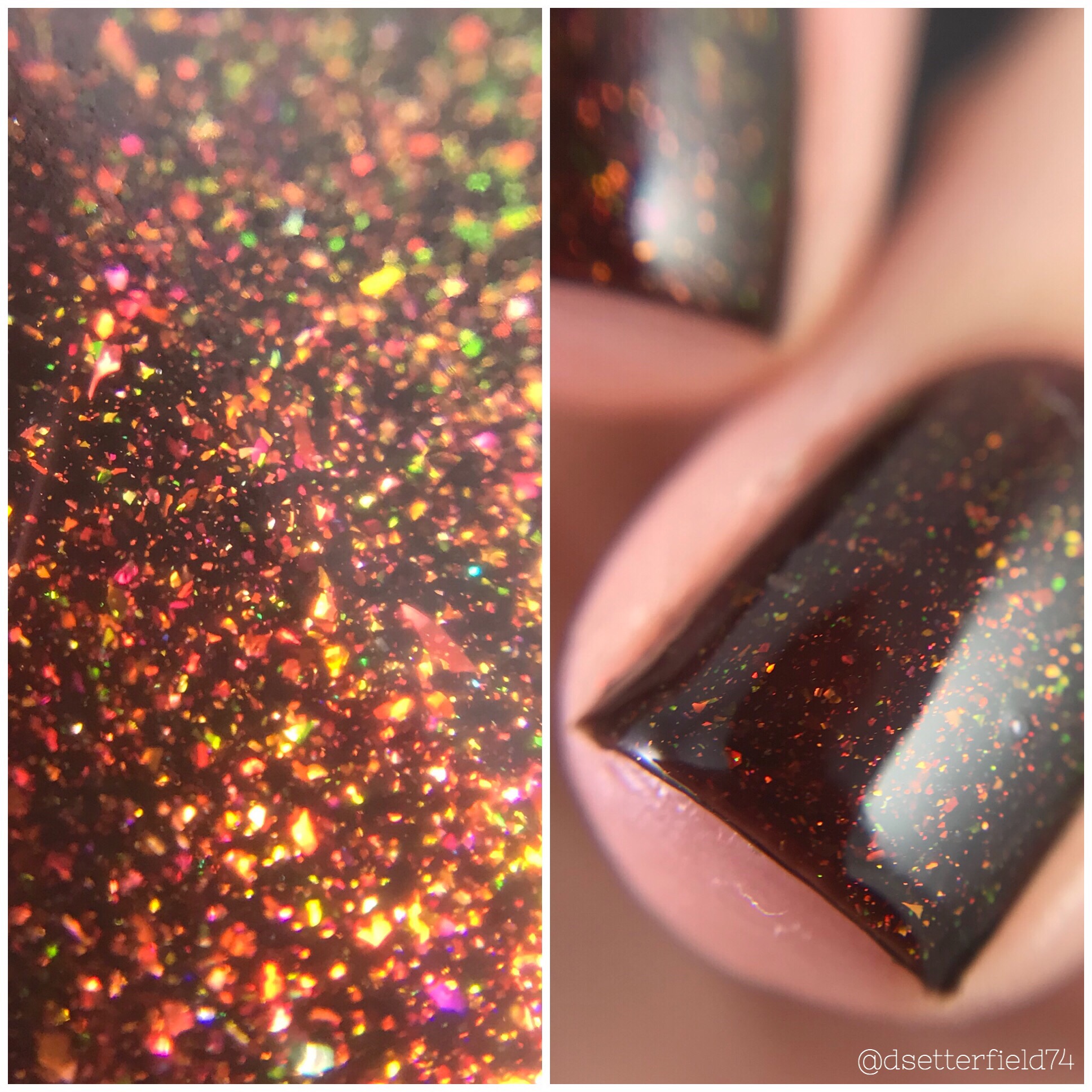 DESCRIPTION:  A rich brown with a mix of holographic flakies, violet shimmer and pink and orange multichrome flakies