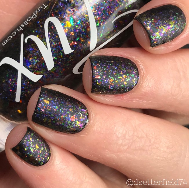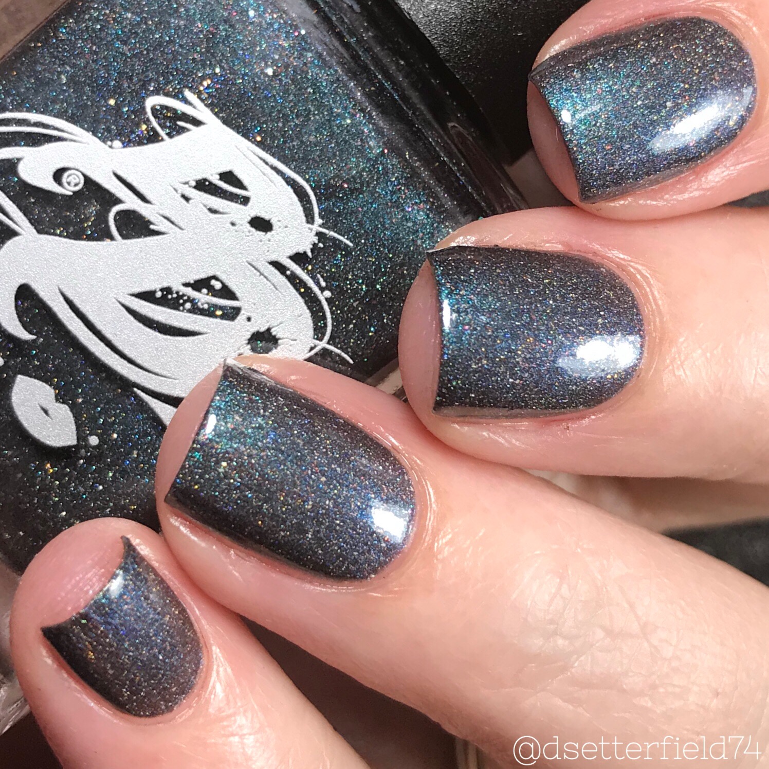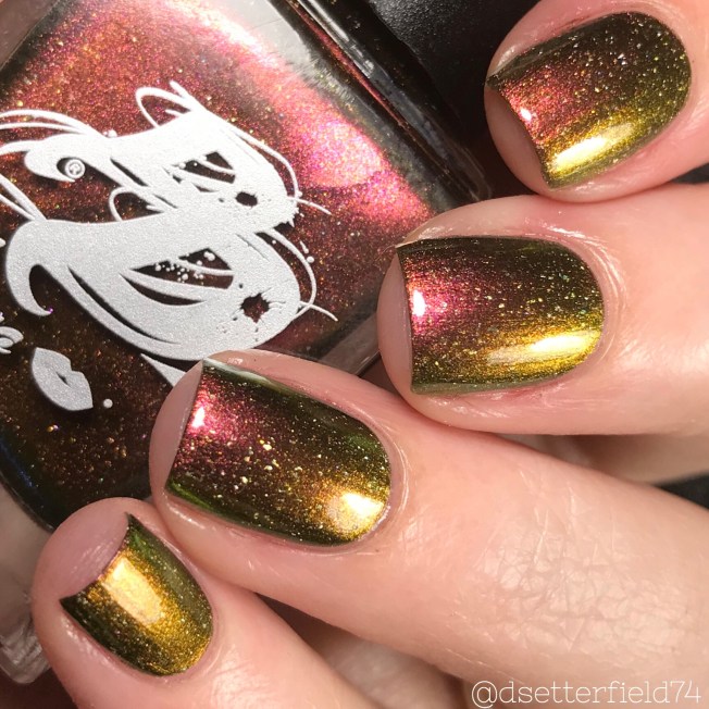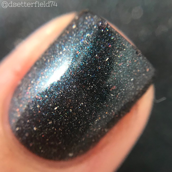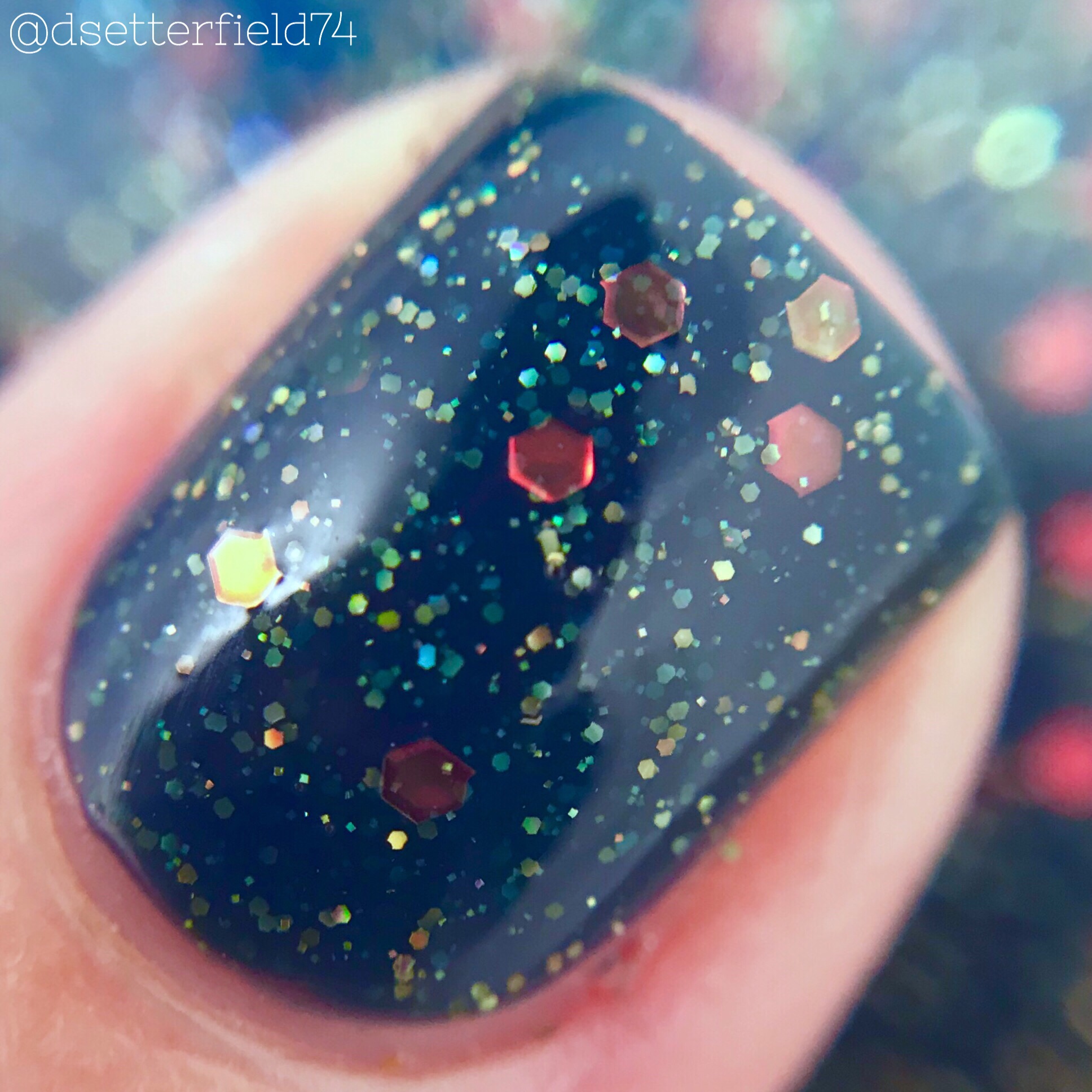 DESCRIPTION: A black/grey jelly base with a strong red-orange/gold/green shifting shimmer, linear holographic and red/orange/gold shifting flakies