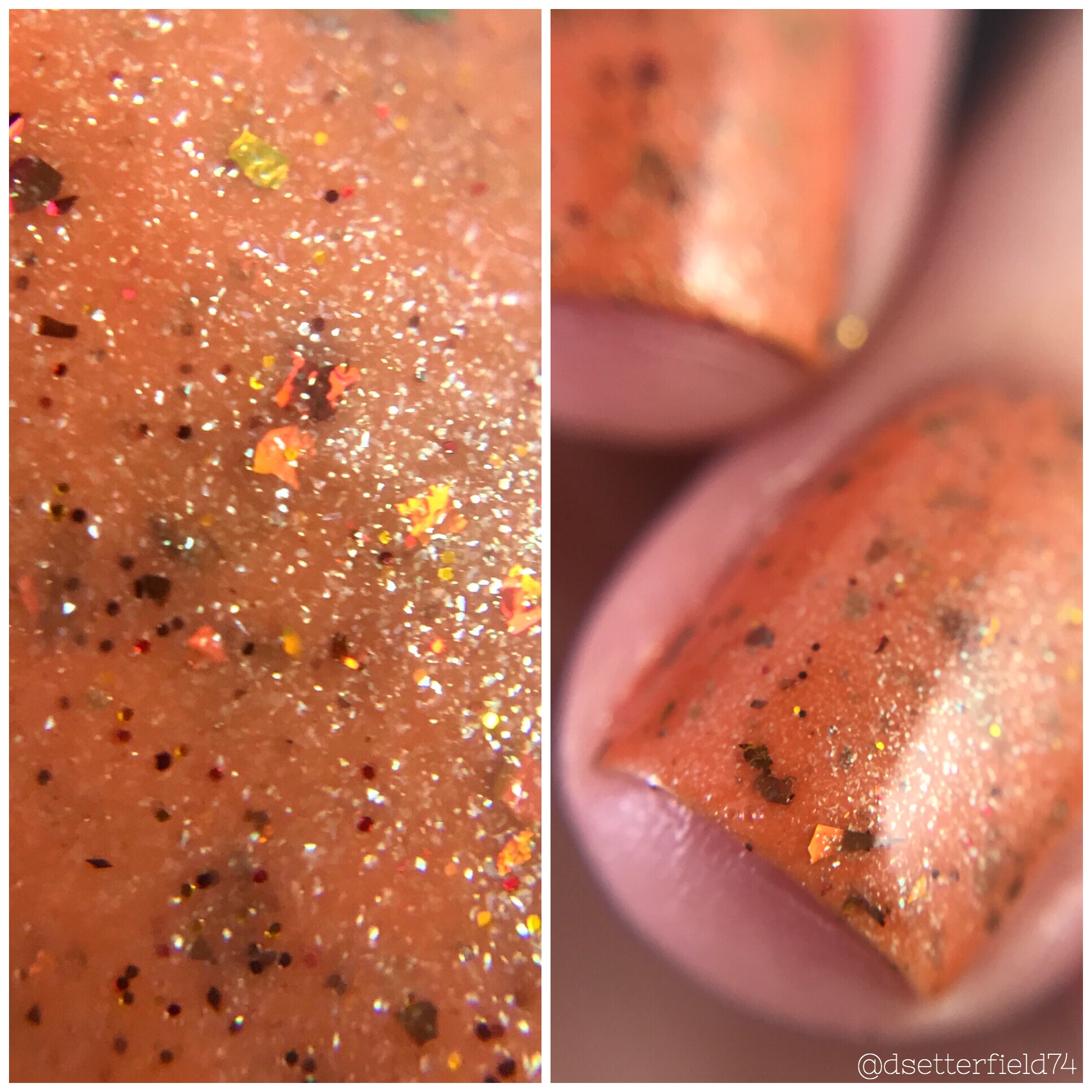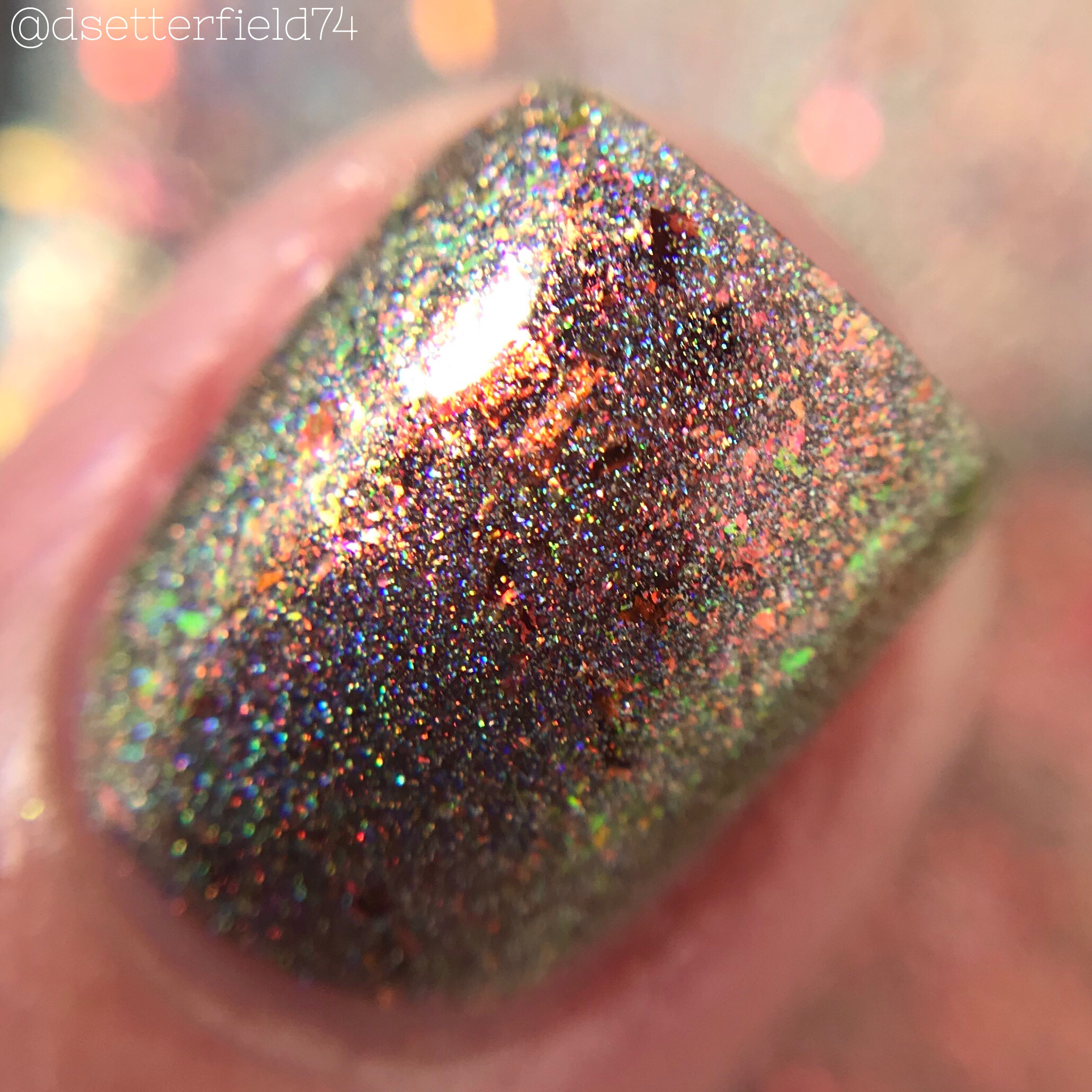DESCRIPTION:  A tangerine base with subtle red tones, a sparkling orange/gold/green multichrome micro flake shimmer and a light touch of holographic pigment