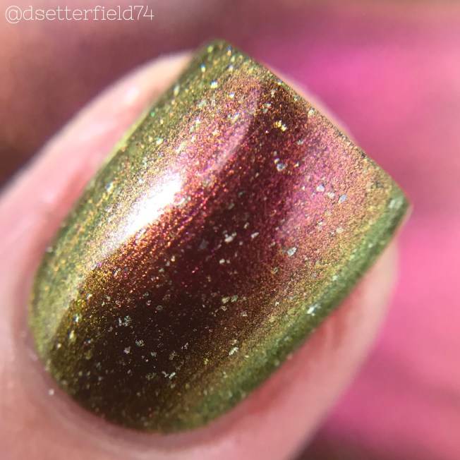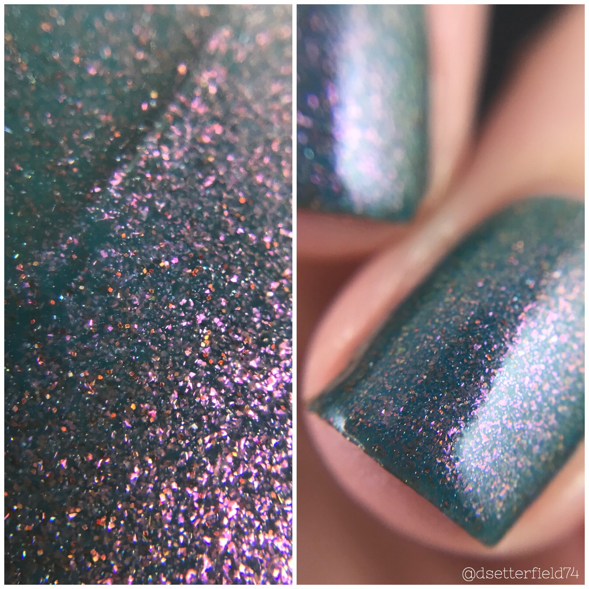 DESCRIPTION:  A slight teal green base with rose/golden multichrome and large particle color shifting shimmers and scattered holo