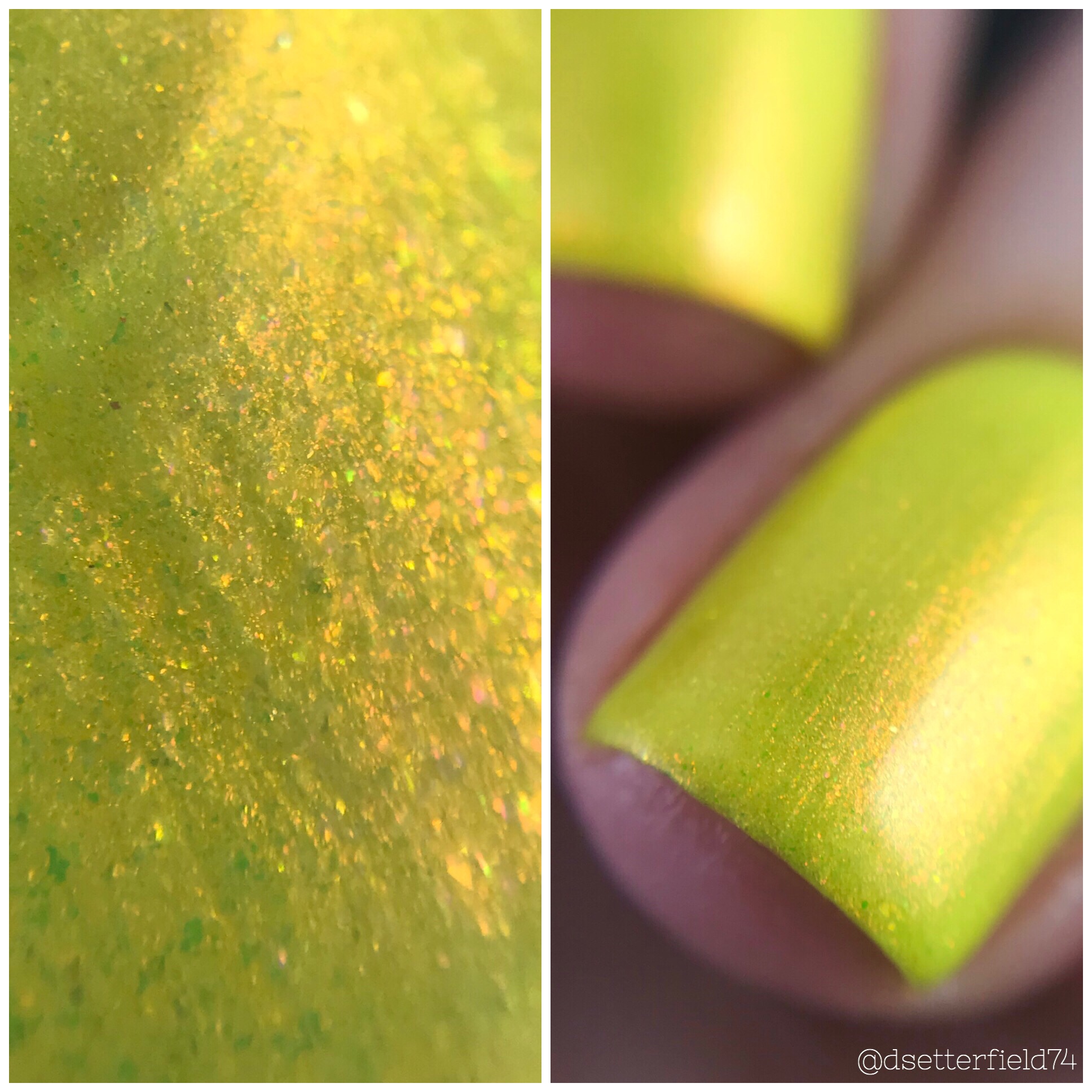 DESCRIPTION: A yellow with strong red/pink shimmer and large shimmer particles
