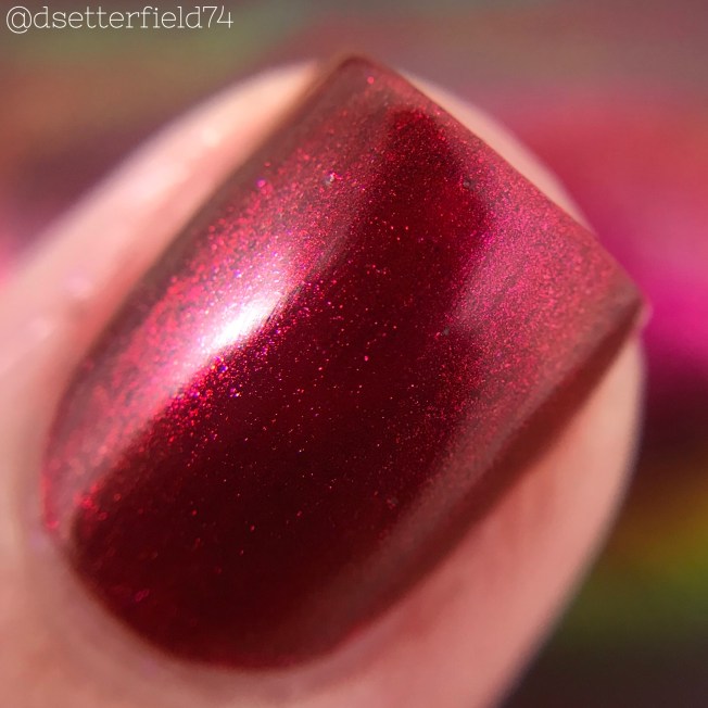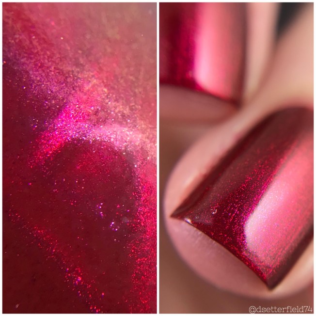 DESCRIPTION:  A deep strawberry red with holographic shimmer, small iridescent violet glitters, violet shimmer and violet multichrome flakies