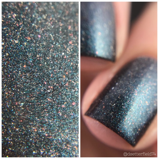 DESCRIPTION:  A faded teal with a pink/bronze shifting shimmer, small orange holographic glitters and a touch of scattered holo
