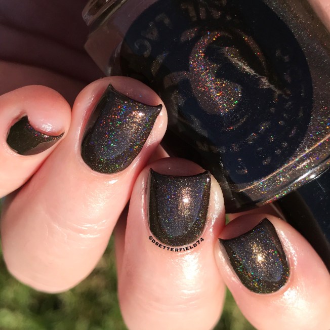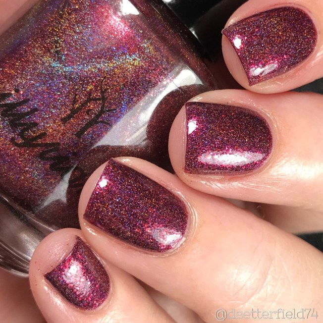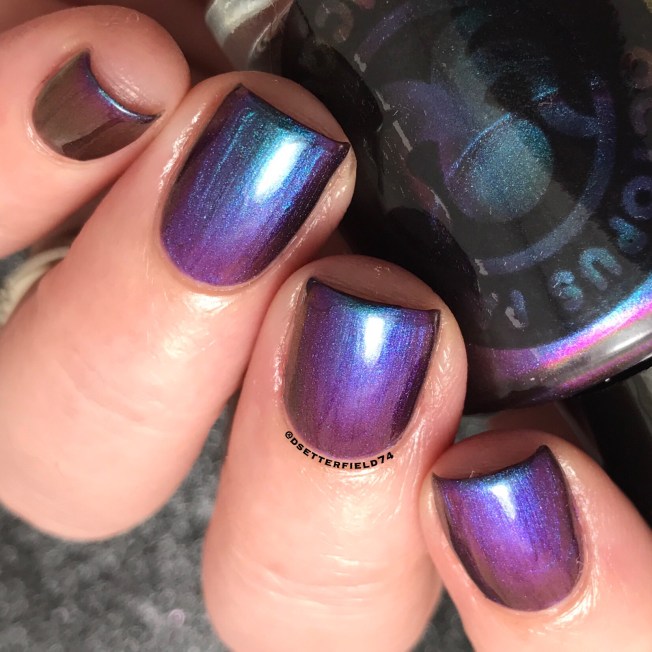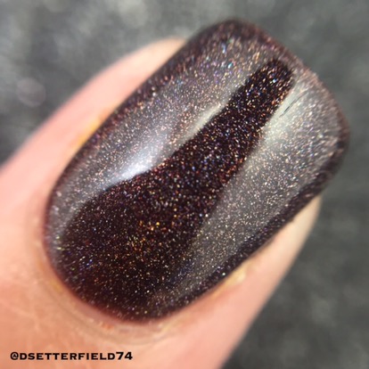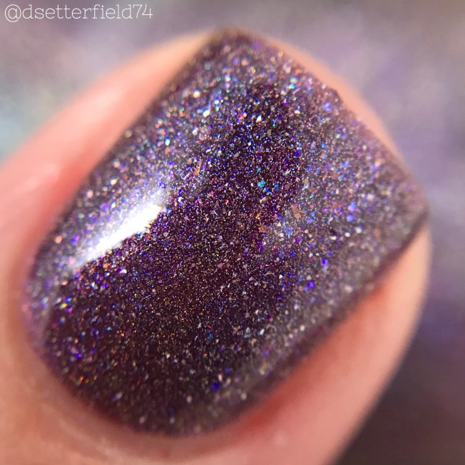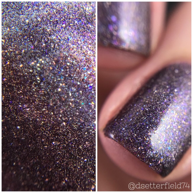 DESCRIPTION: A charcoal mauve holographic with gold flakies, purple/indigo shifting pigment and iridescent purple glitter