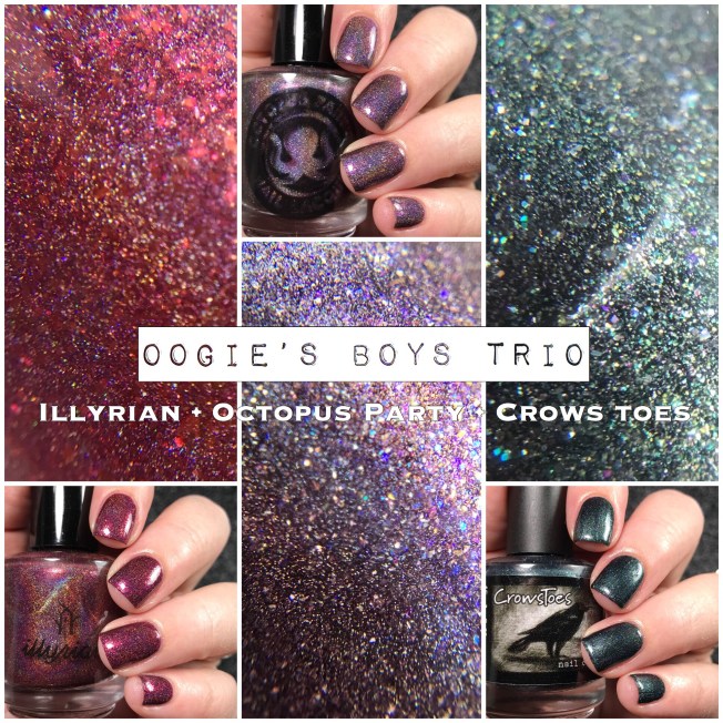 This is the Oogie’s Boys Trio, a collaboration between Illyrian Polish, Octopus Party Nail Lacquer and Crows Toes. Ummm, three awesome brands, three gorgeous polishes, available all with the click of ONE tiny button? Is Leonardo happening next, cuz BEST DAY EVER is clearly in full effect.