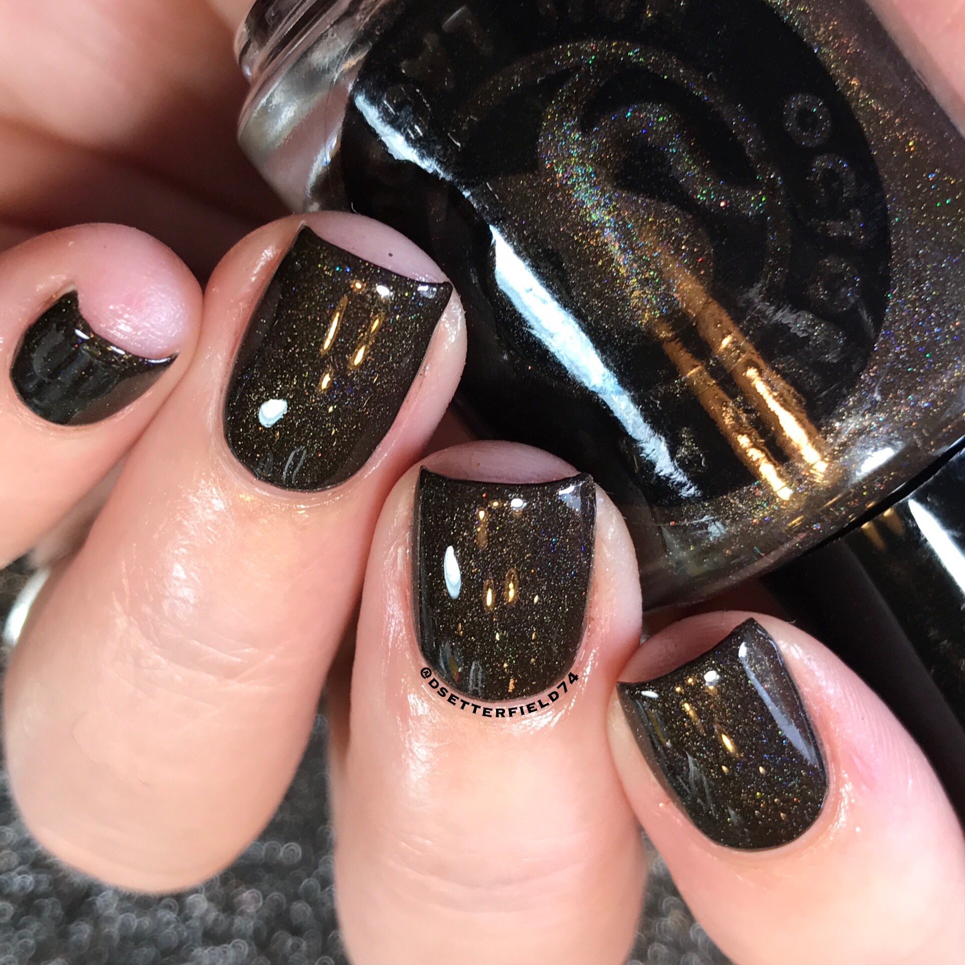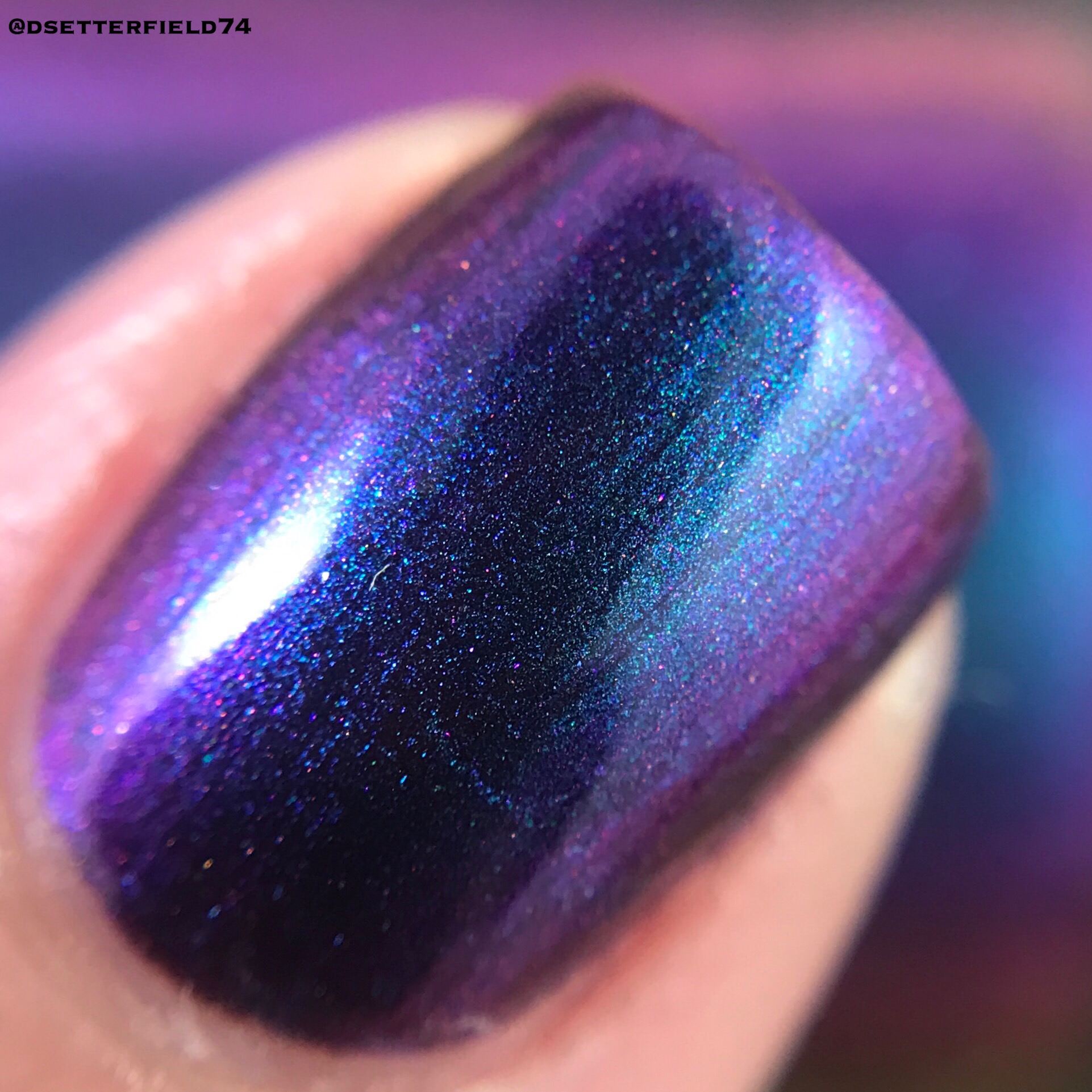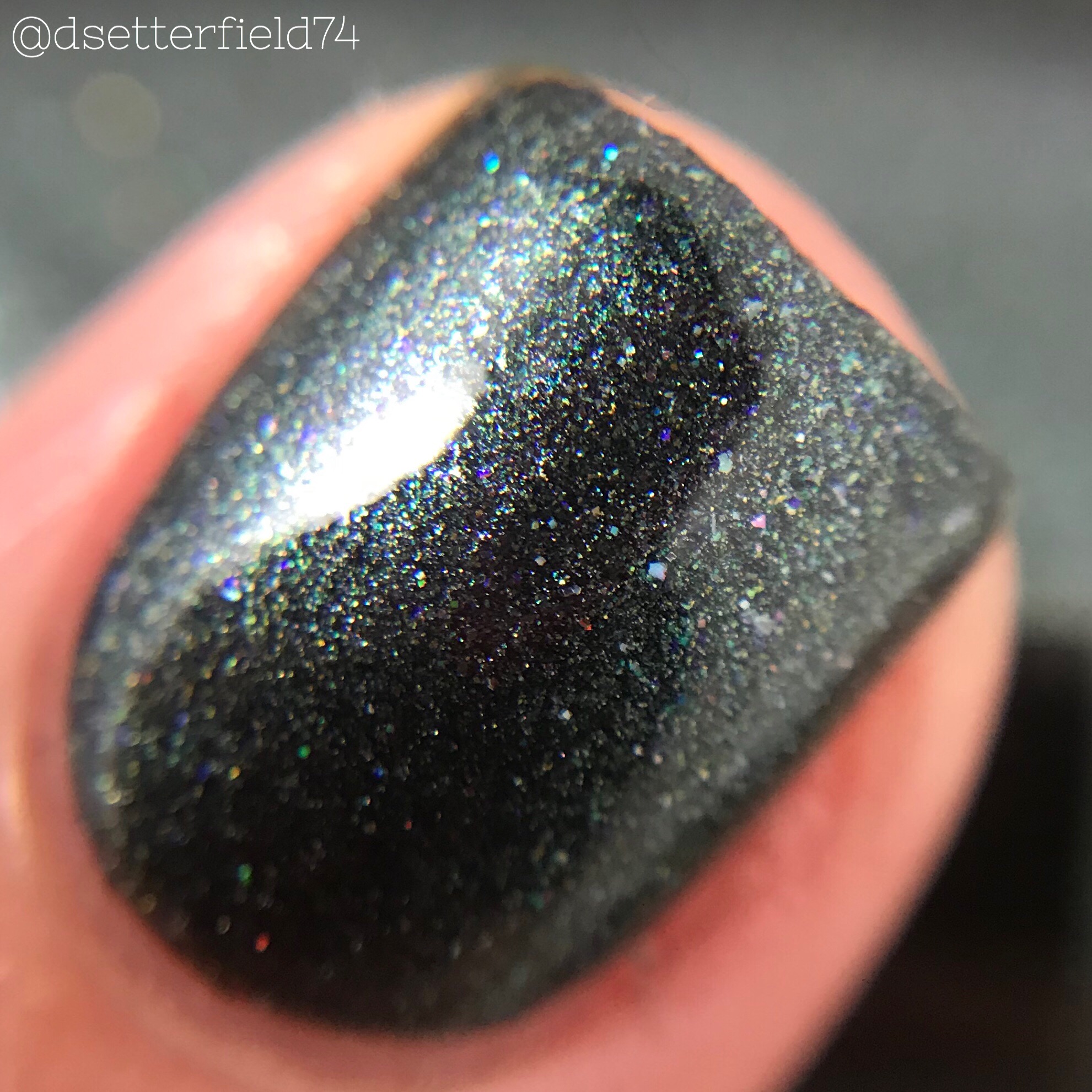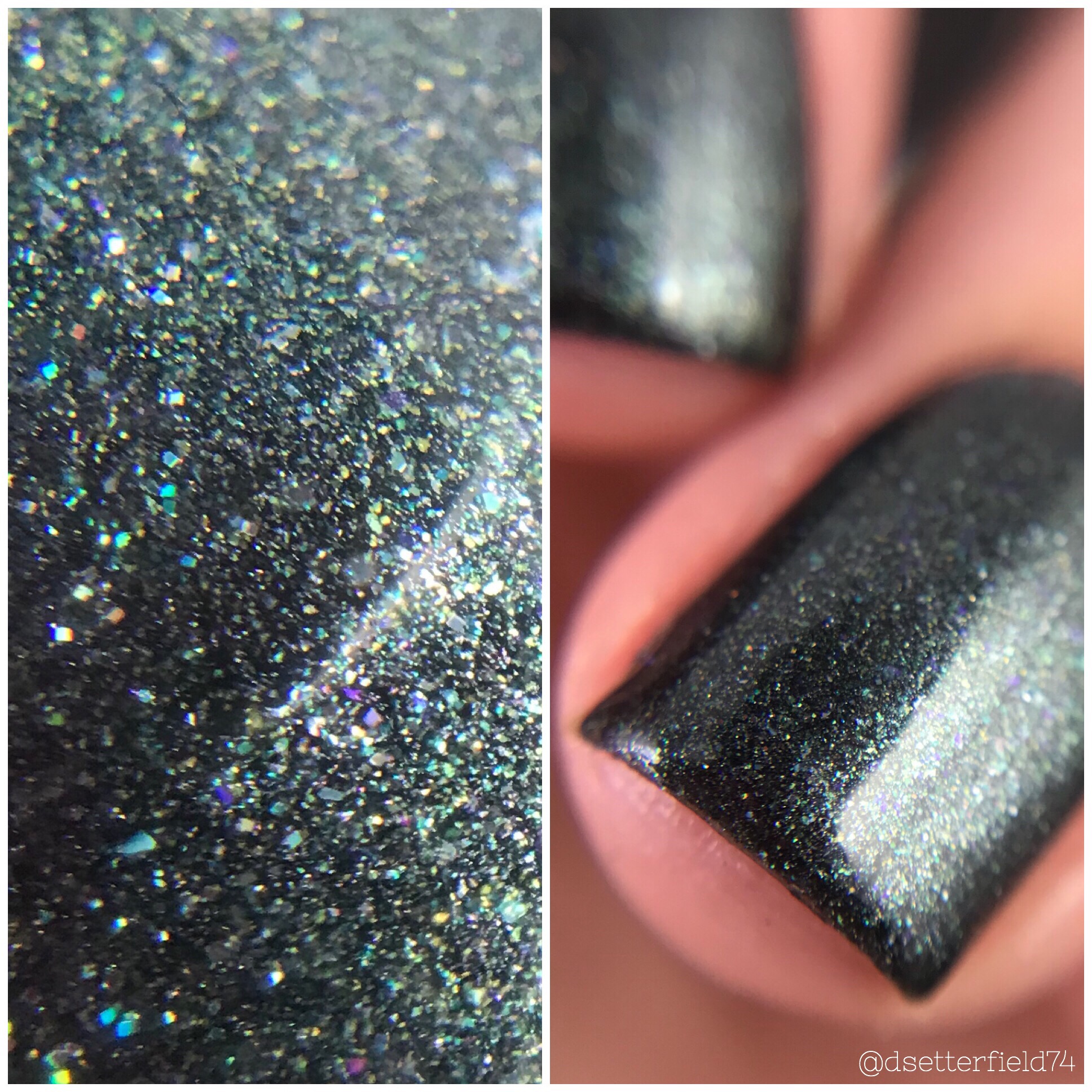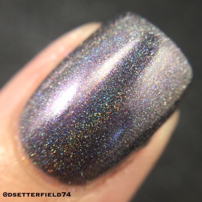 DESCRIPTION: A charcoal mauve holographic with gold flakies, purple/indigo shifting pigment and iridescent purple glitter