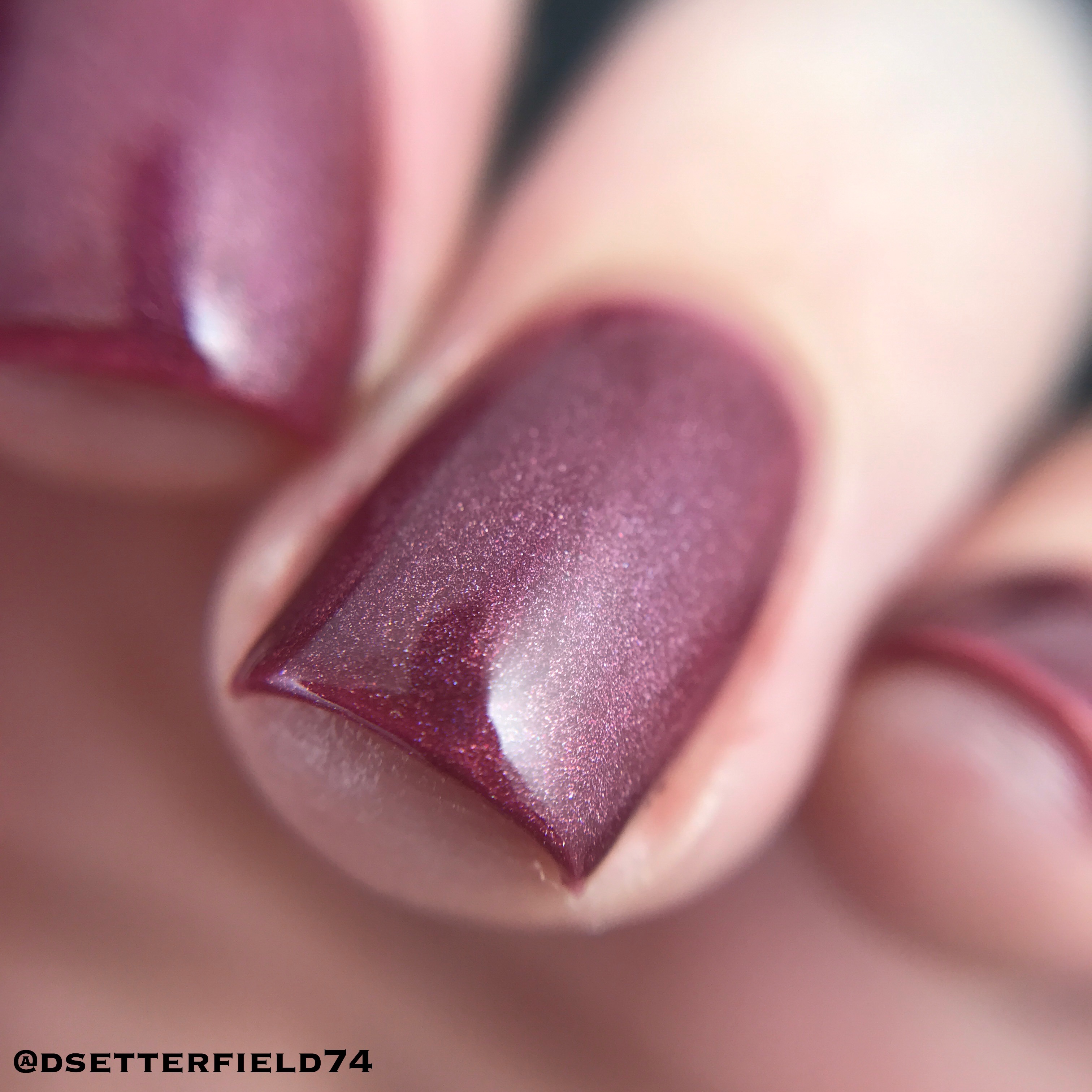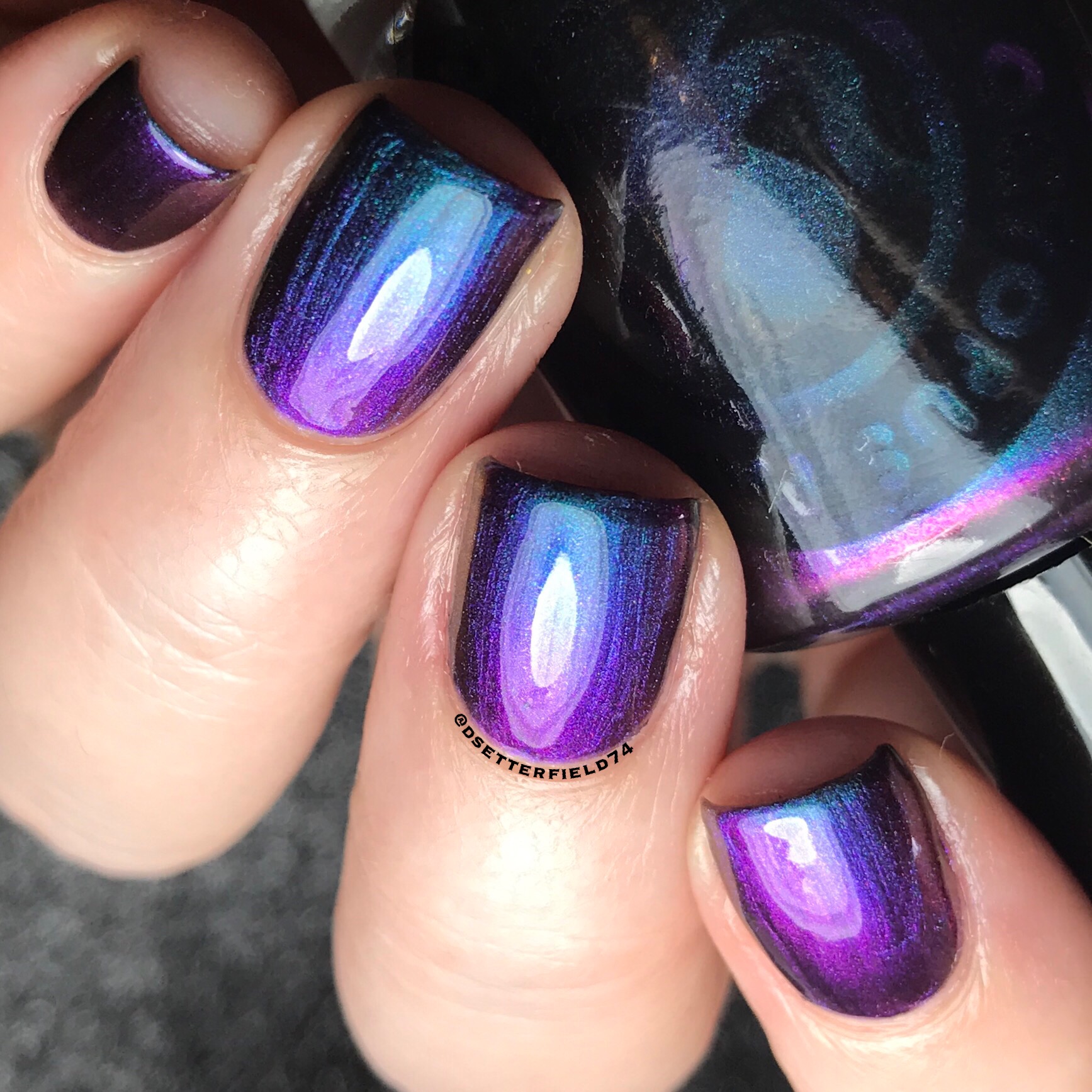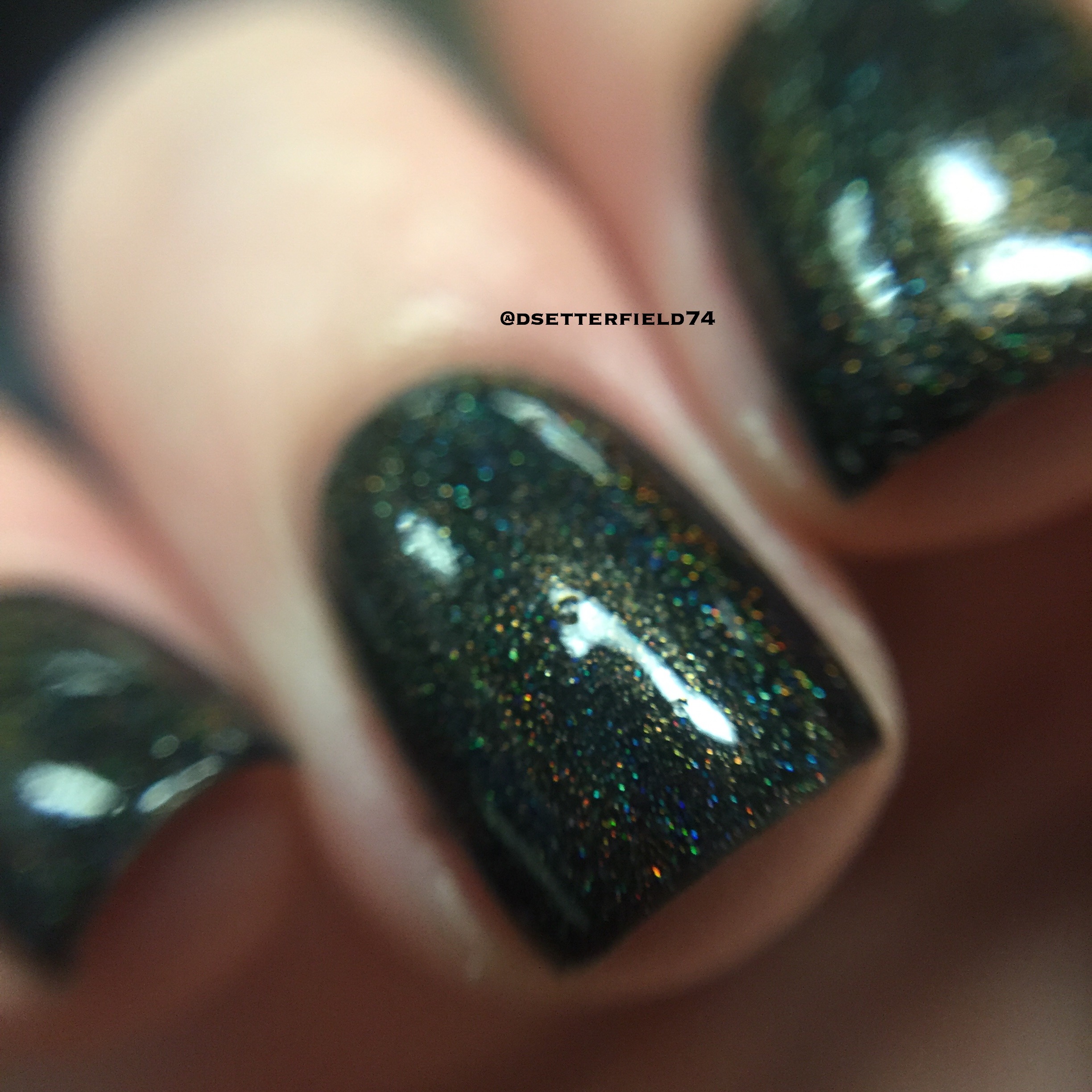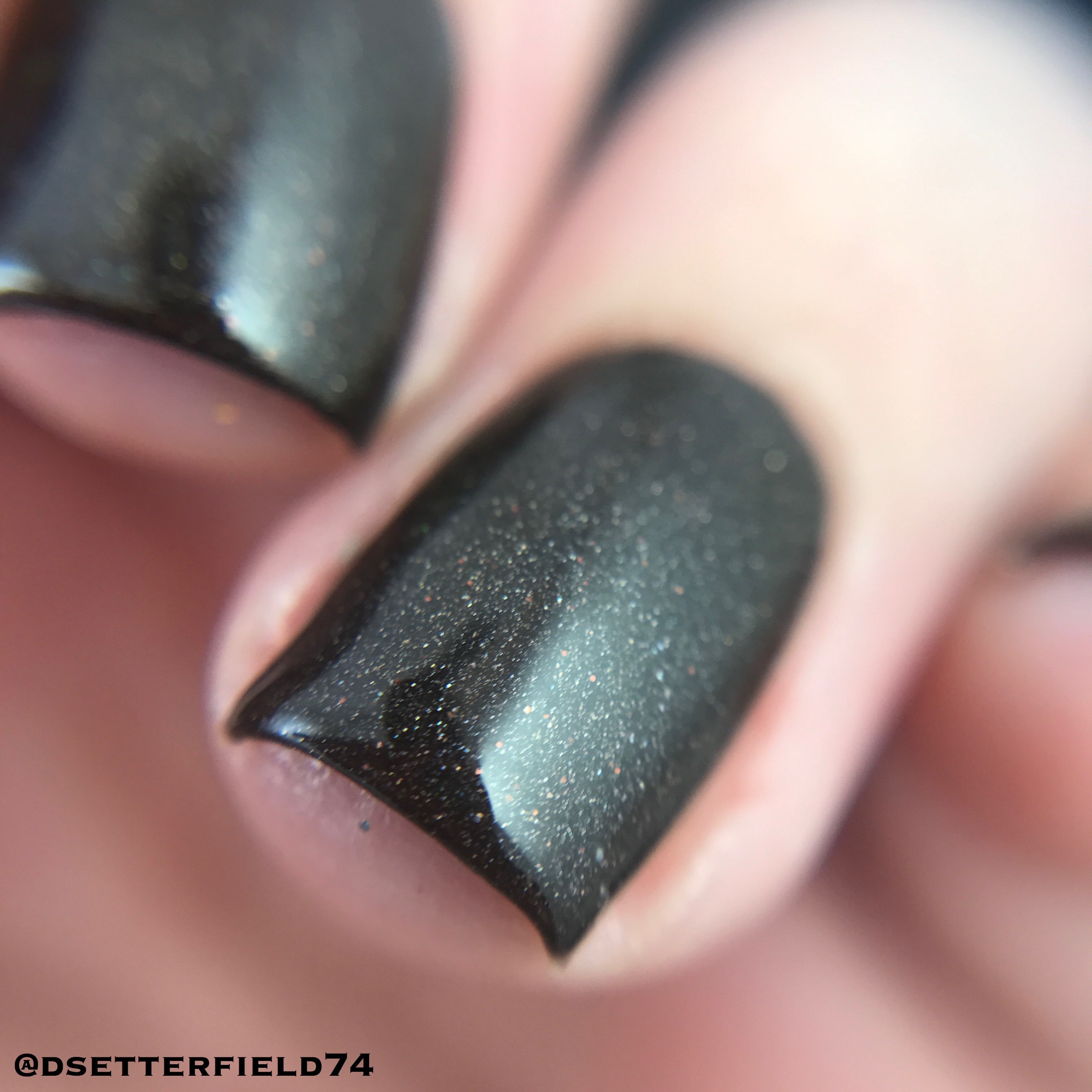 DESCRIPTION: A charcoal mauve holographic with gold flakies, purple/indigo shifting pigment and iridescent purple glitter