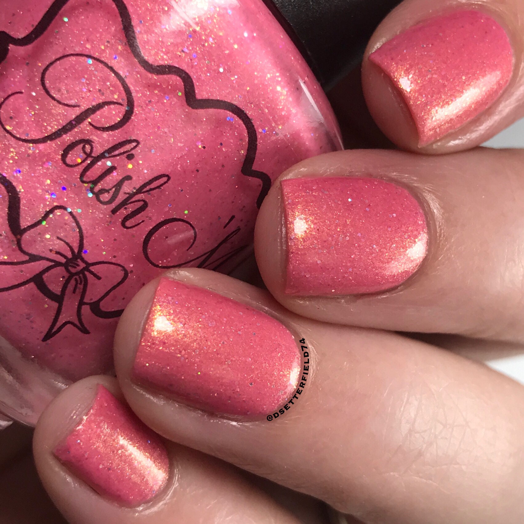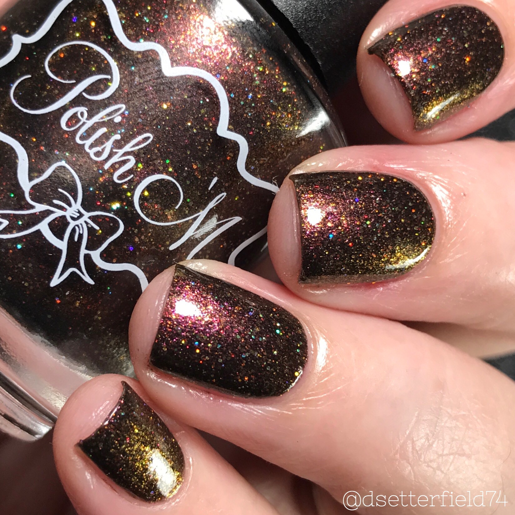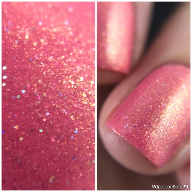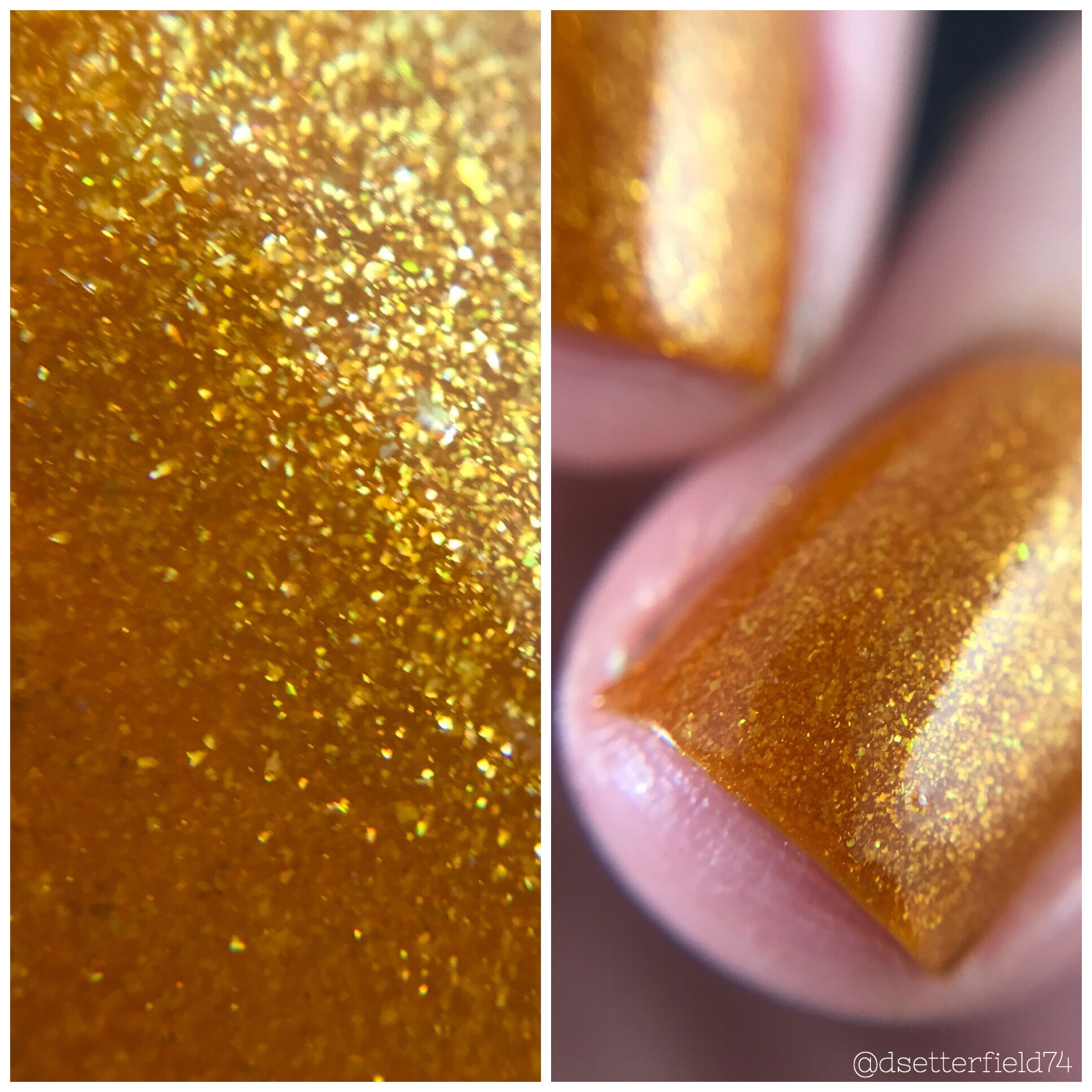 DESCRIPTION: A holographic gold metallic base with subtle green shift, iridescent pink flakies and gold shimmer