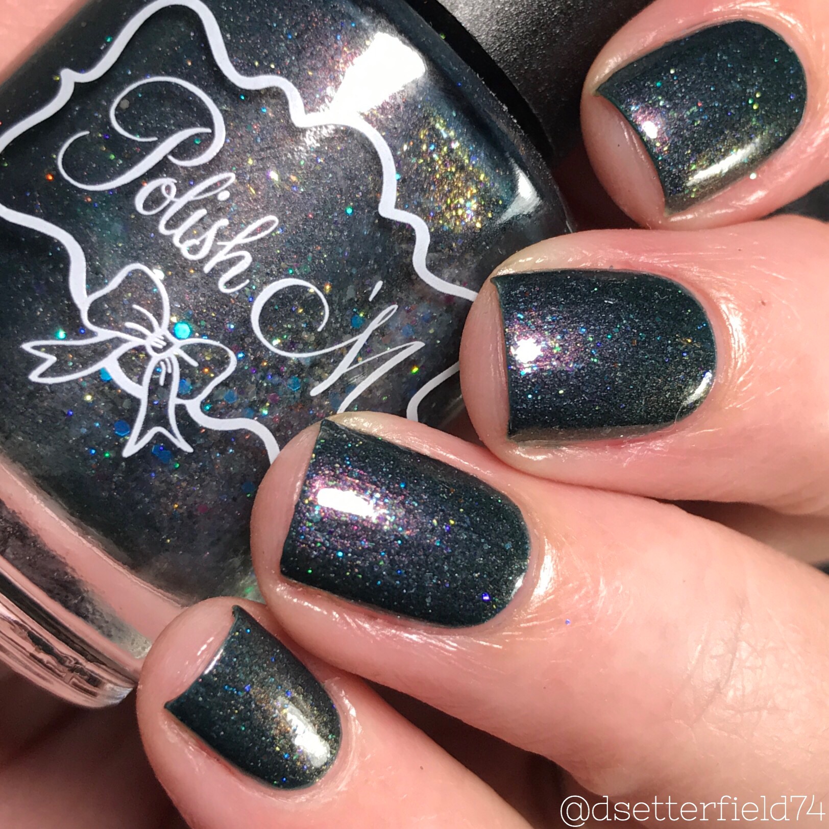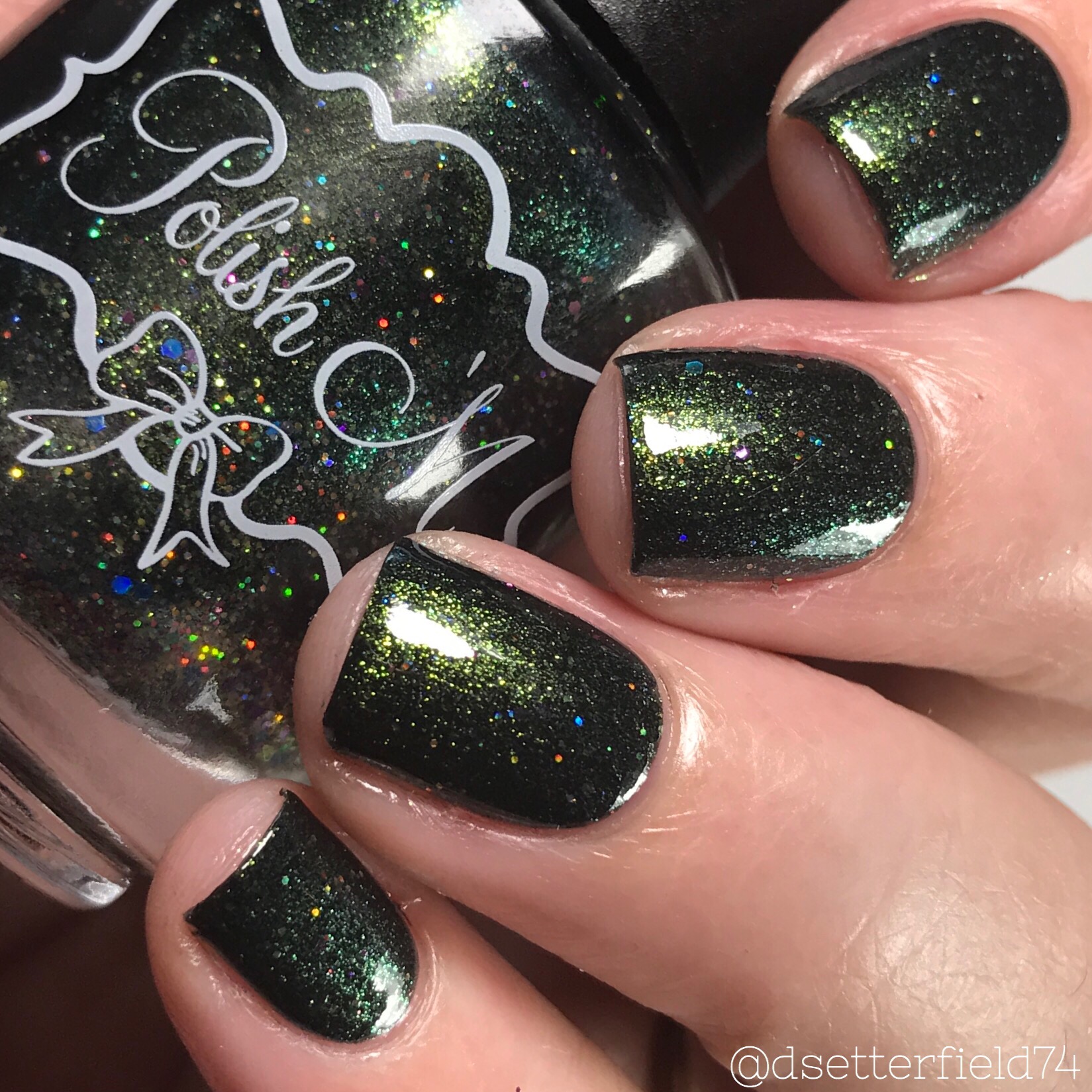 DESCRIPTION: A dark gunmetal crelly with blackened green to purple duochrome shift, silvery blue and dark violet flakies and champagne/red and purple/blue shifting glitter flakes