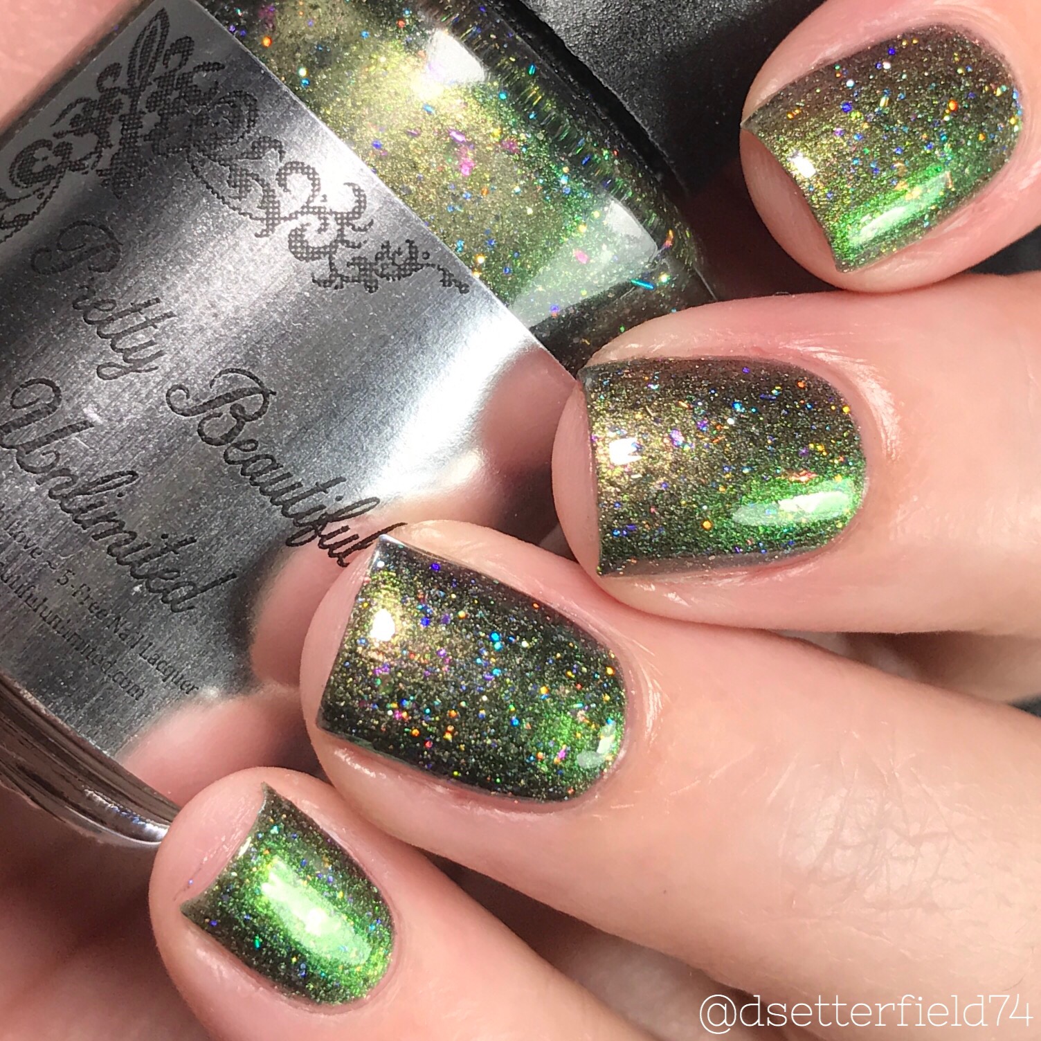 DESCRIPTION: A holographic gold metallic base with subtle green shift, iridescent pink flakies and gold shimmer