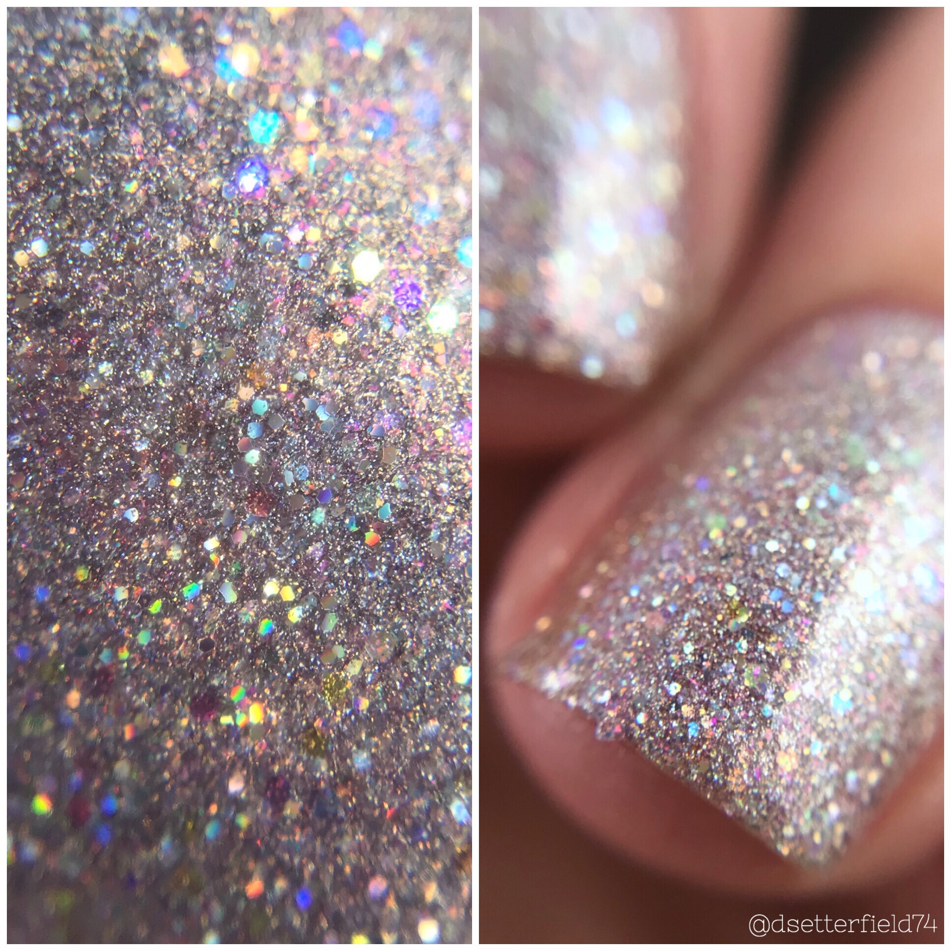 DESCRIPTION: A pastel pearlized green base with a beautiful mix of powder and green, gold and silver hexagon glitters