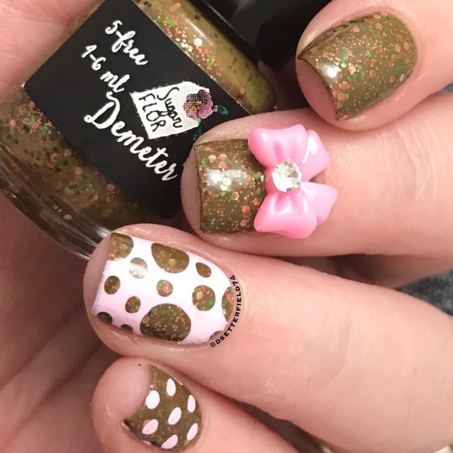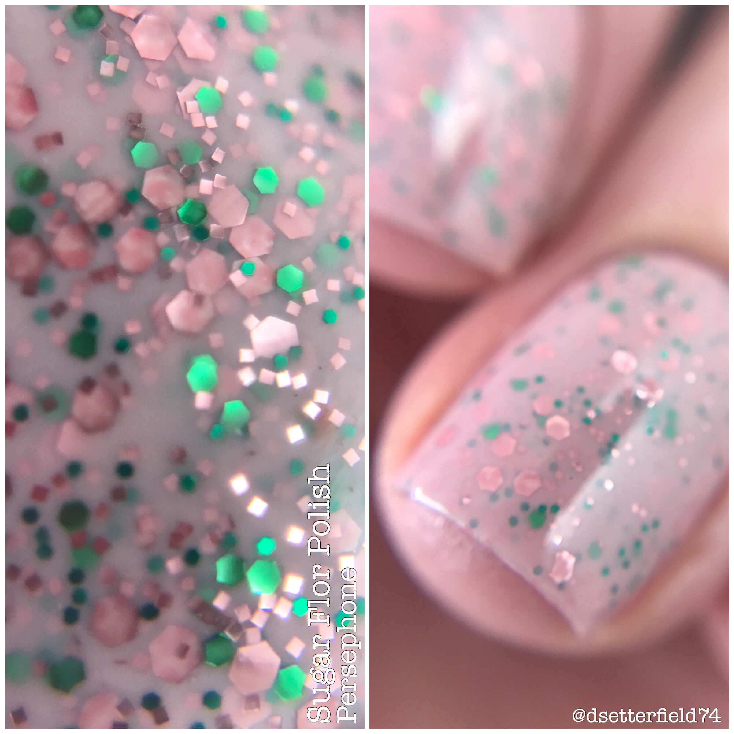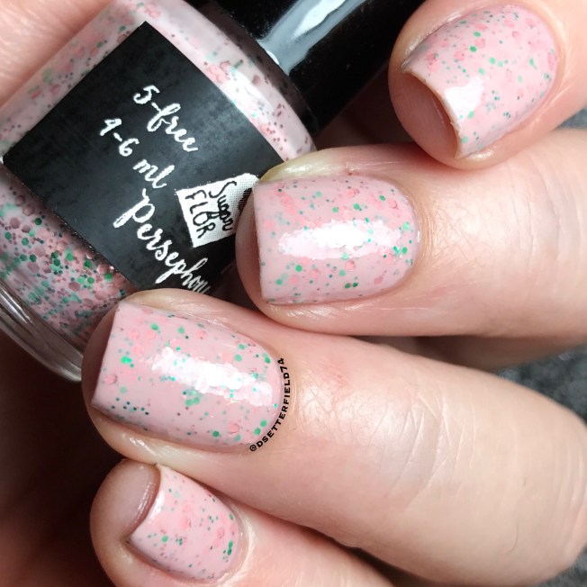 Persephone is the Goddess of the springtime, flowers and vegetation, so NAILED IT doesn’t even begin to describe this scenario. The pink crelly base couldn’t be more perfect, and those darker pink and green glitters have the words yes, please written all over them. (Seriously, I checked.) Looks delicate, but covers really well in practically one coat, although two was required to smooth everything out.