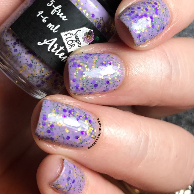 So this one has a mid-toned purple crelly base loaded with green, gold and dark purple glitter. Purple and green is one of my favorite color combos, so naturally I loved this. Two easy coats, which I may love even more.