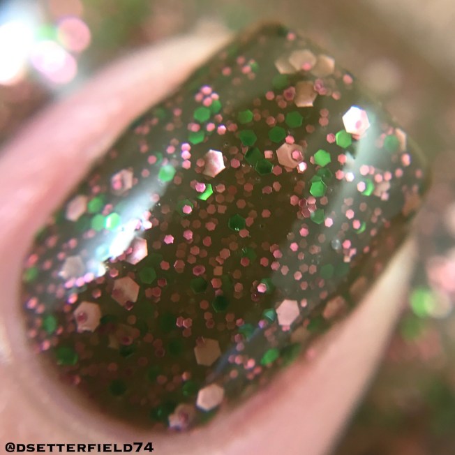 So this one has a lovely dark olive green crelly base with a spectacular pink and dark green glitter mix. I find this color strangely soothing. It’s an uncommon shade, and that’s what I love the most. It’s special. Rare. Surprising, even. Perfect for a spring collection, if you ask me. I’ll take a hundred more bottles, you know, in case there’s a painting-all-the-surfaces situation spontaneously happening while hubby is holding the remote control and NOT PAYING ATTENTION TO HIS WIFE, for chrissake. I’ll be honest: I need monitored from time to time.