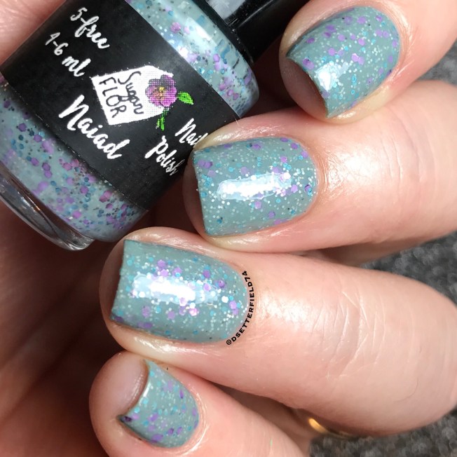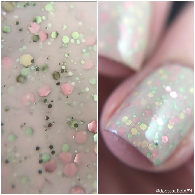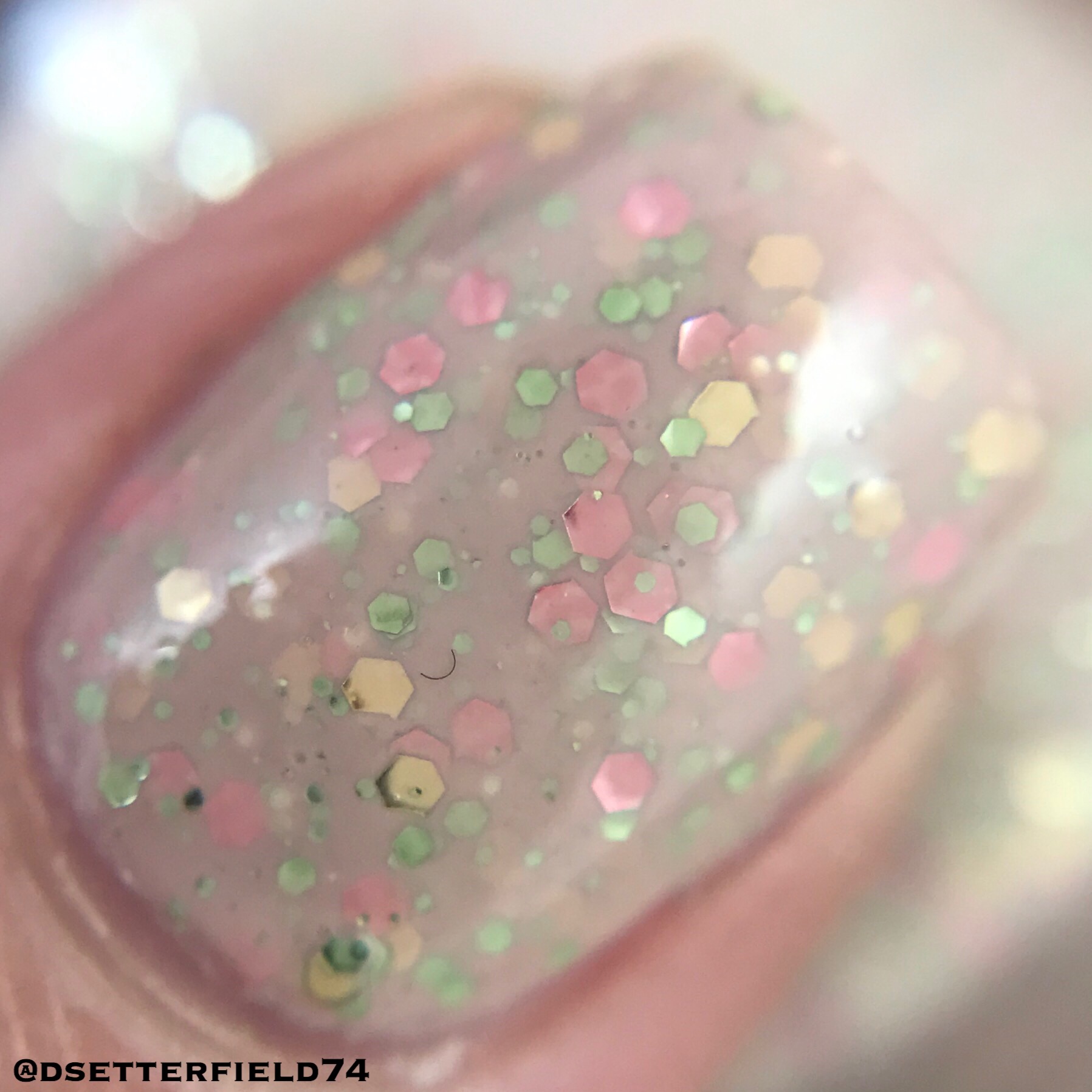 Here we have a pale pink crelly base with pink, gold, and light green glitter. In my photos and in real life, the pale pink pulled more beige on me, which still worked out just fine. I love the dainty look of this one!