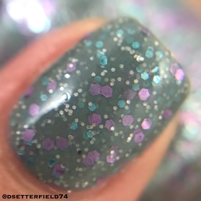 So this one is described as a dark aqua base with silver, turquoise and light purple glitter. There are times, however, like in the macro below, where indirect lighting resulted in less aqua more slate grey/green. Like a dirty aqua, I guess. Either way, though, I lub it lots.