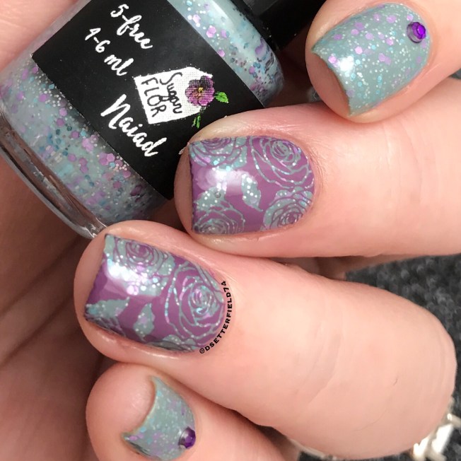 Used the Lina Feeling Shapely 07 for the gold pattern and the 4 Seasons-Spring 01 plate for the flowers, if you’re curious.