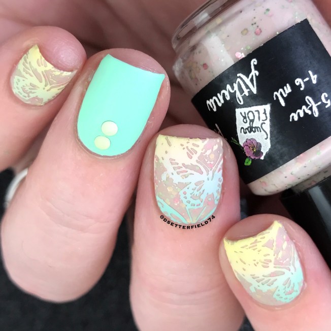 There are times like this one where I wished my nails were a mile long. The grungy butterfly image from the Lina Make Your Mark 01 plate is such a cool one, although sadly only about a half inch can be seen. I hope y’all see butterflies when you see these nails, and not just some random blobs of polish. On the bright side, more gradient stamping, which means who am I and what have I become? A gradient stamper MASTER, clearly.