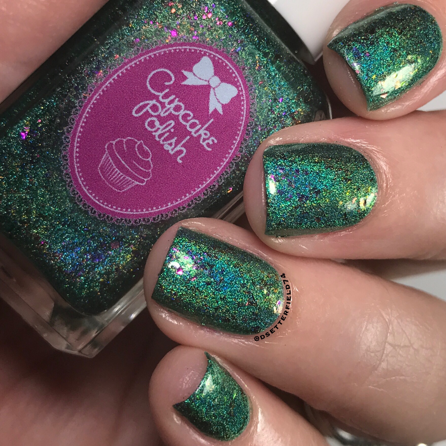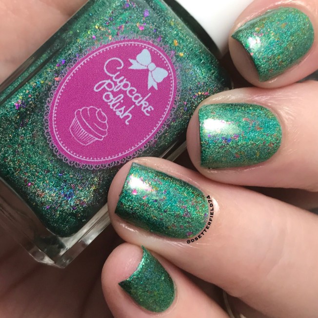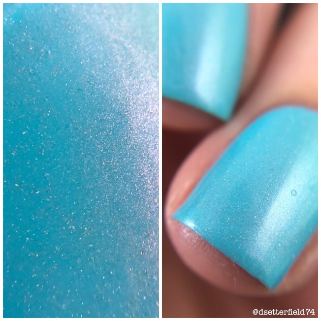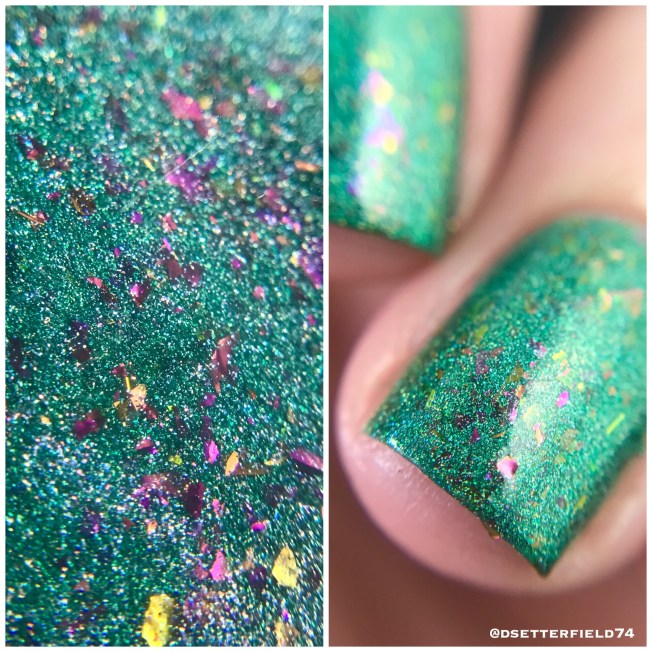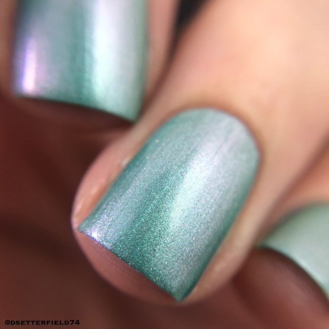 Another new to me brand! This one is a fun one, for sure. I don’t think I’ve ever used a pearlized base before, and the finish of it is super cool. And although it has a different look to it, with top coat the surface dries completely glassy. Well, and don’t even get me started on those tiny green glitters. Cuz I could just sit here and love them for the next 37 years.