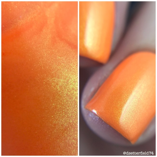 DESCRIPTION: A bright coral base with red, orange and slightly pink shimmer